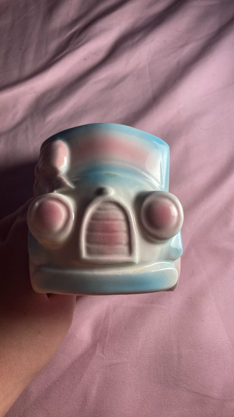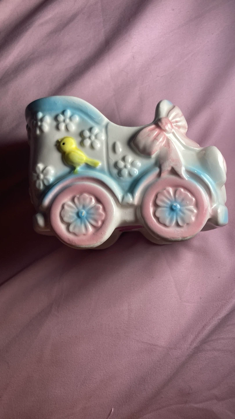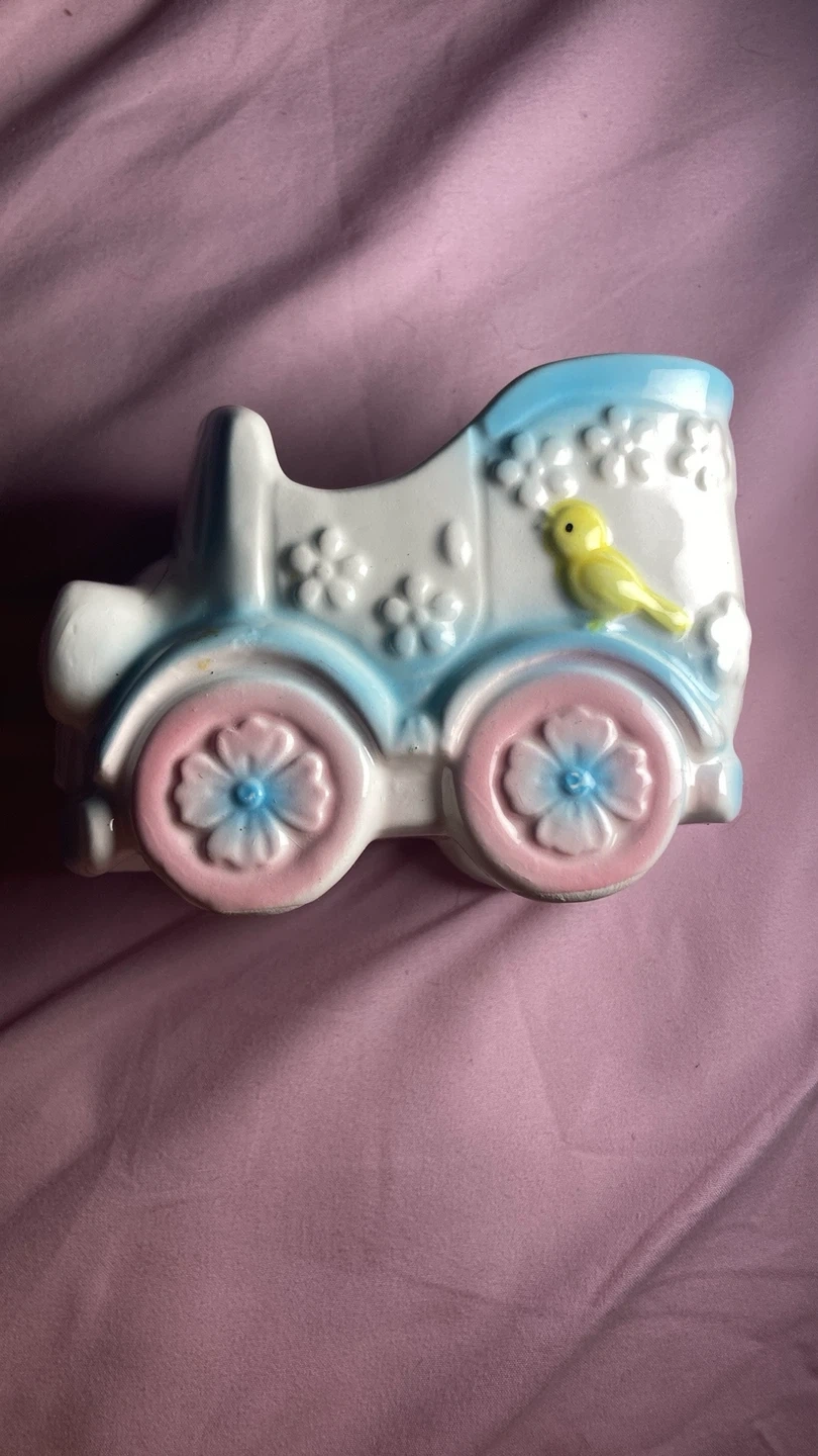 This is a charming ceramic shaped like a baby carriage. It features delicate floral accents and a sweet little bird. It's perfect for holding small plants or as a decorative piece.