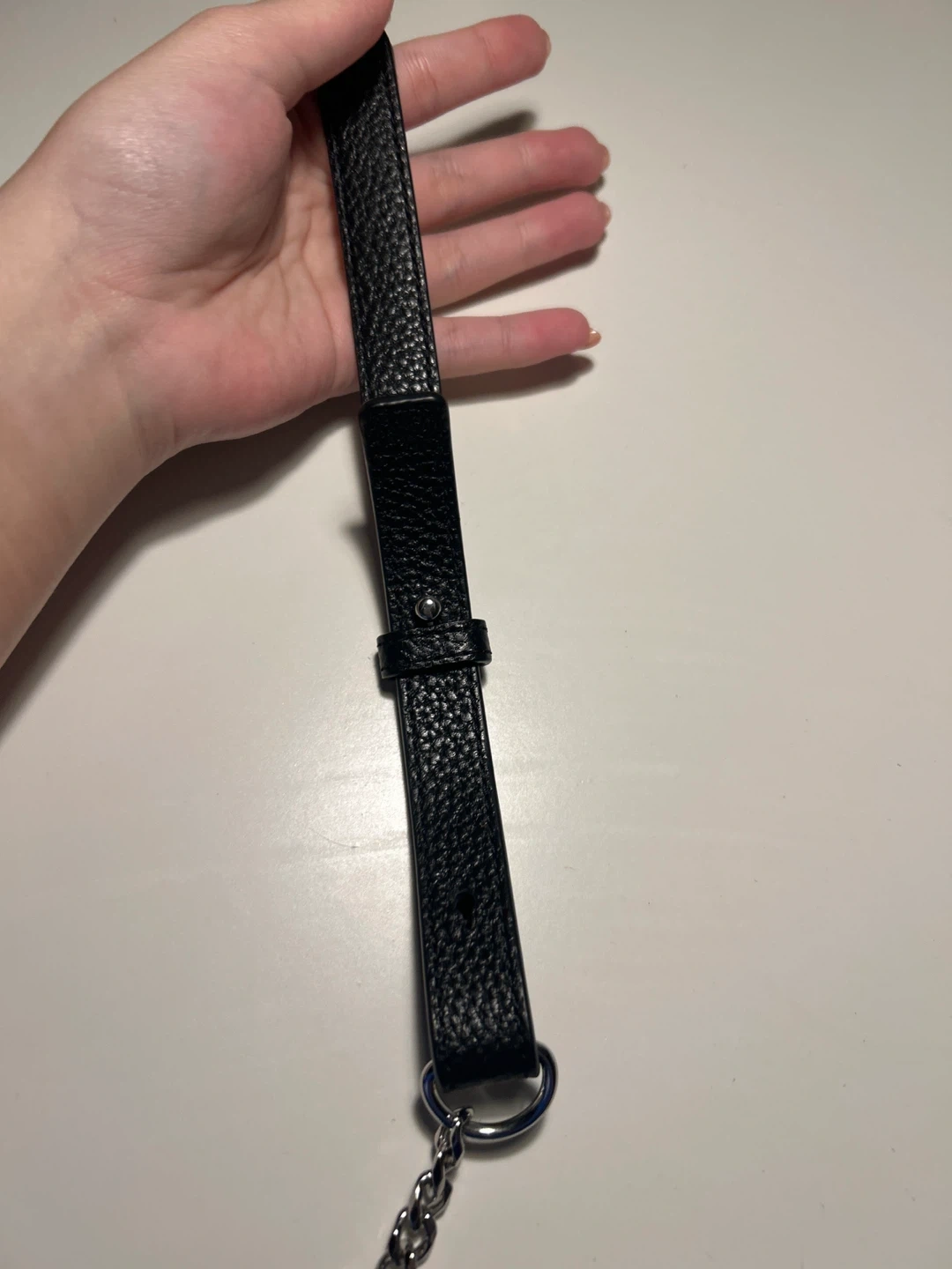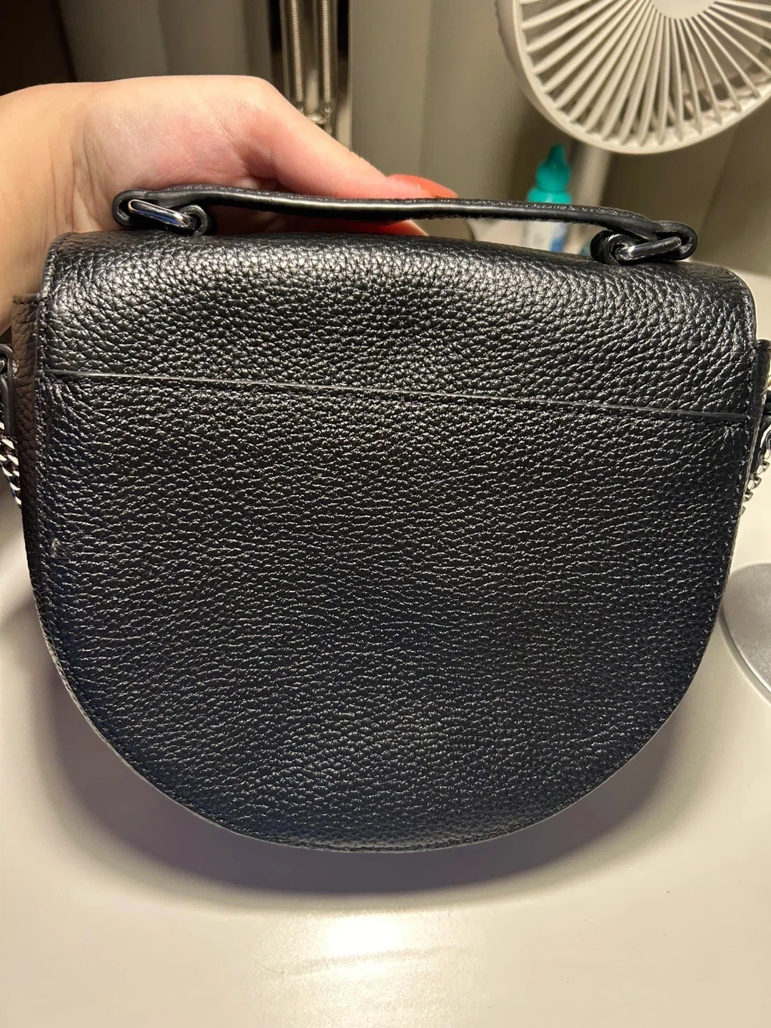 A stylish black leather shoulder bag by Lacoste. It features a textured finish and a silver-tone chain strap for a chic look. This bag's compact size makes it perfect for carrying essentials on the go. it is a cross body bag