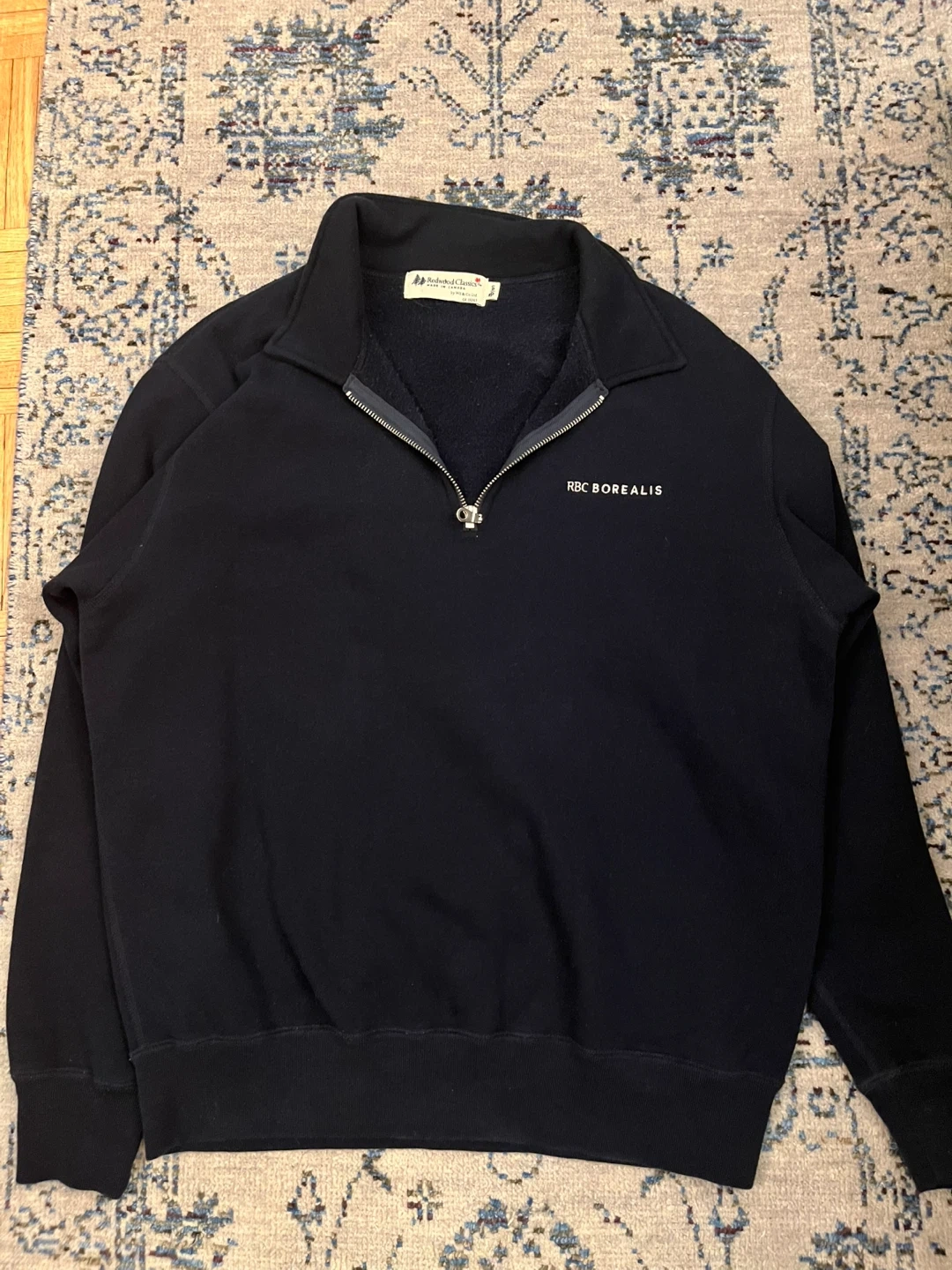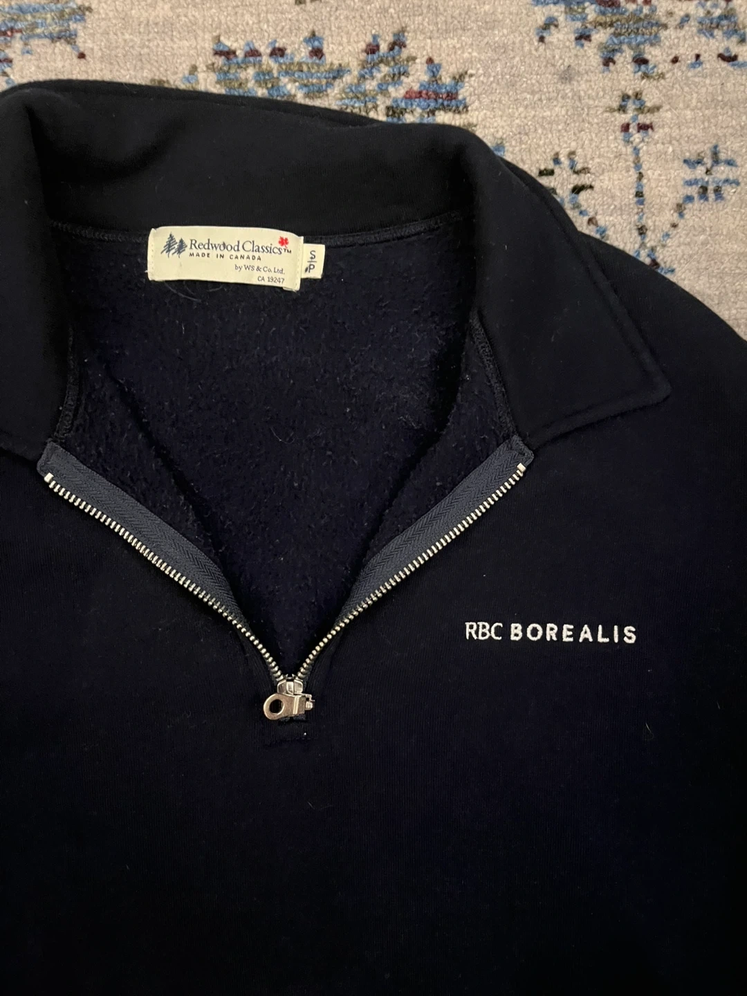Navy quarter-zip sweatshirt by Redwood Classics, featuring "RBC Borealis" embroidered on the chest. Made in Canada. Size small.