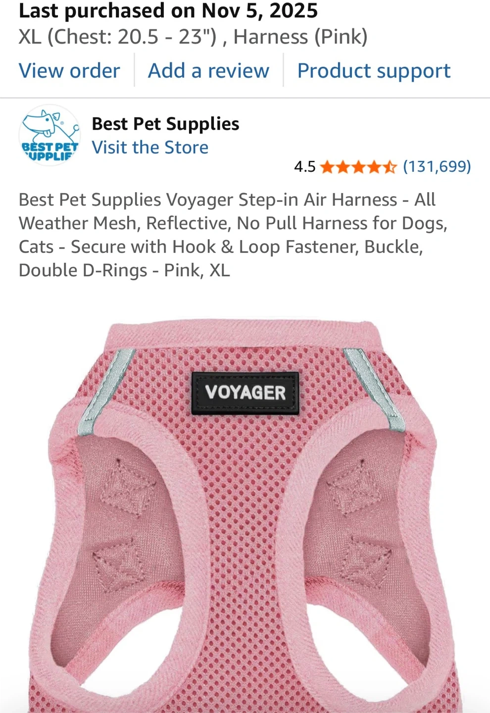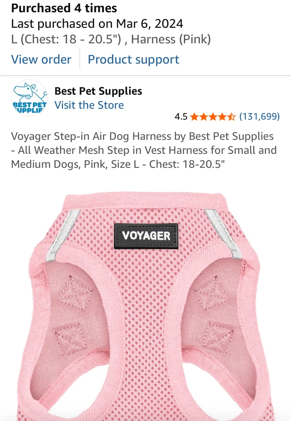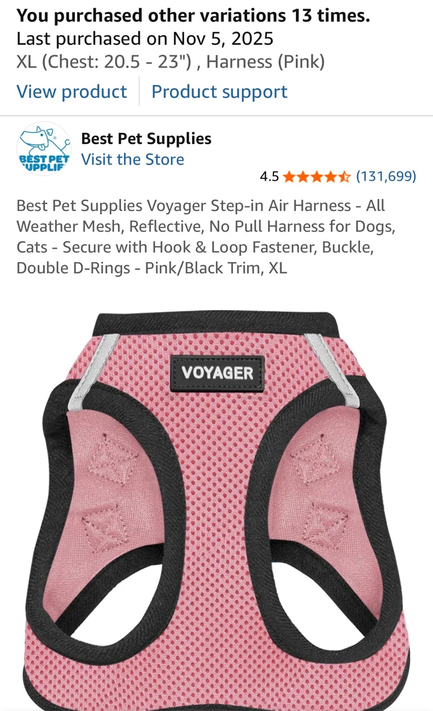 I don’t buy any other type of harness’ except these ones and I uploaded different various pics through Amazon to show that I always buy these and it says 13 various ones because maybe I didn’t like the colour and I sent it back. Seems like I only like the pink my dog. In any case, this is the best I saw some of the reviews saying the Velcro doesn’t stick. They must’ve got counterfeit because I’ve never had that problem. This is by far one of the best harnesses you can buy on the market. That’s all I can say! Just she outgrew the medium three years ago and it’s been sitting collecting dust and it’s in really really good condition and then she went to a large so she’s a large now, but I got an extra large also because her winter coats are so thick and I like to put it over the winter coat not under so that’s why I have an extra large for winter time so I can bundle her up and put this over her coat coat, etc.