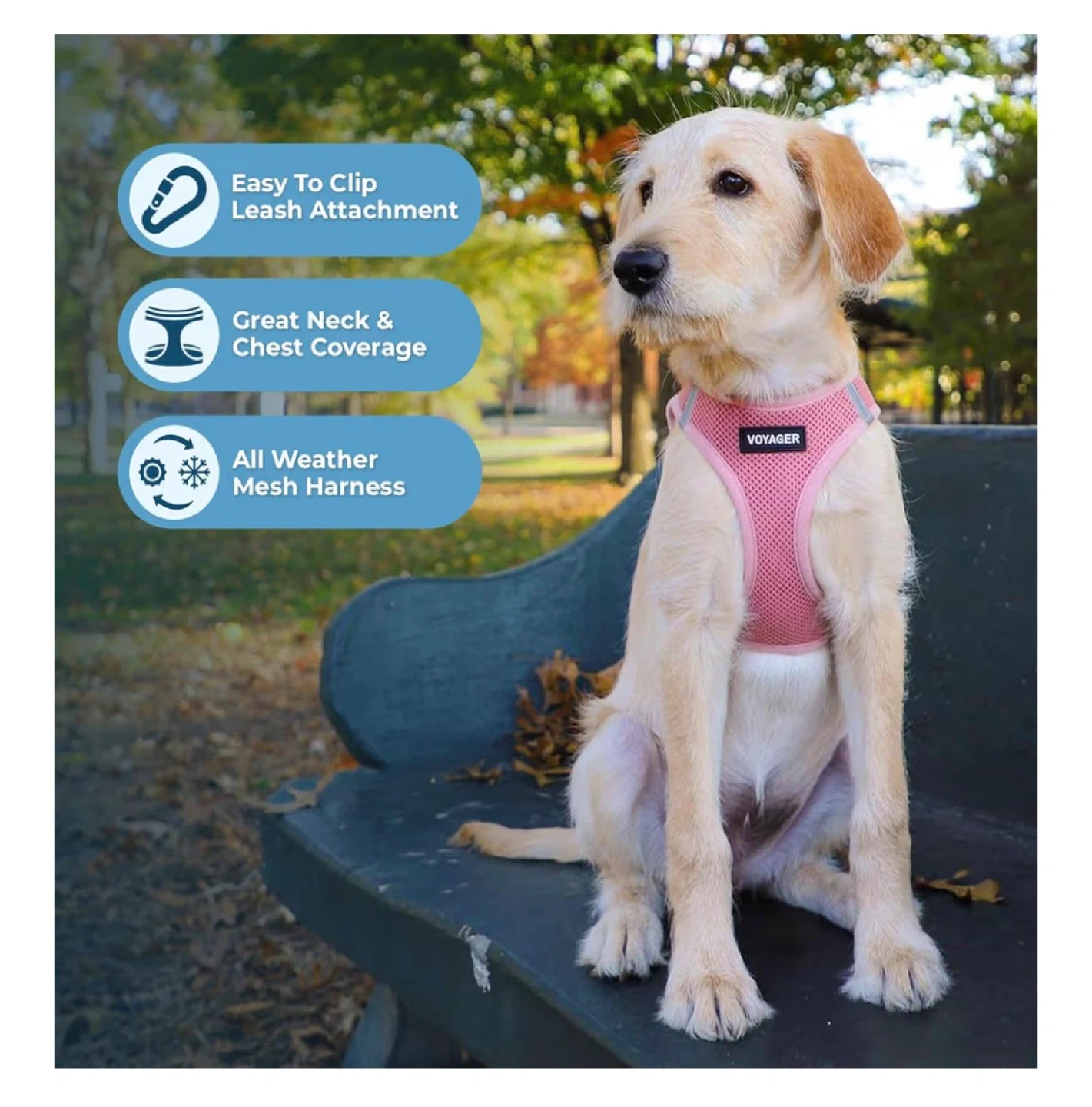 This is a pink mesh step-in harness from Voyager. It's made of breathable mesh material and features reflective strips for visibility. Fastens with a hook and loop closure.