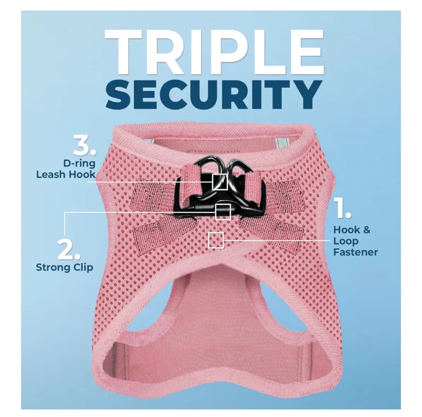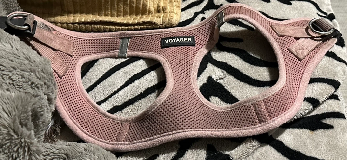 This is a pink mesh step-in harness from Voyager. It's made of breathable mesh material and features reflective strips for visibility. Fastens with a hook and loop closure.