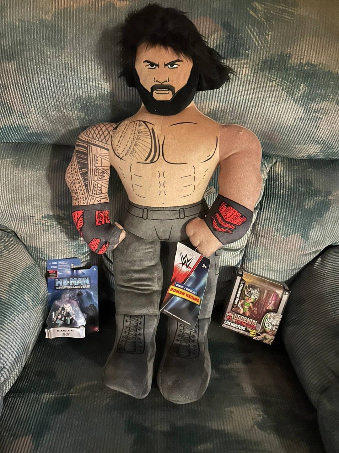 This is a plush toy of WWE wrestler Roman Reigns. It's soft and huggable, perfect for any fan! The toy features Roman Reigns' signature tattoos and wrestling attire. Message me if interested thank u