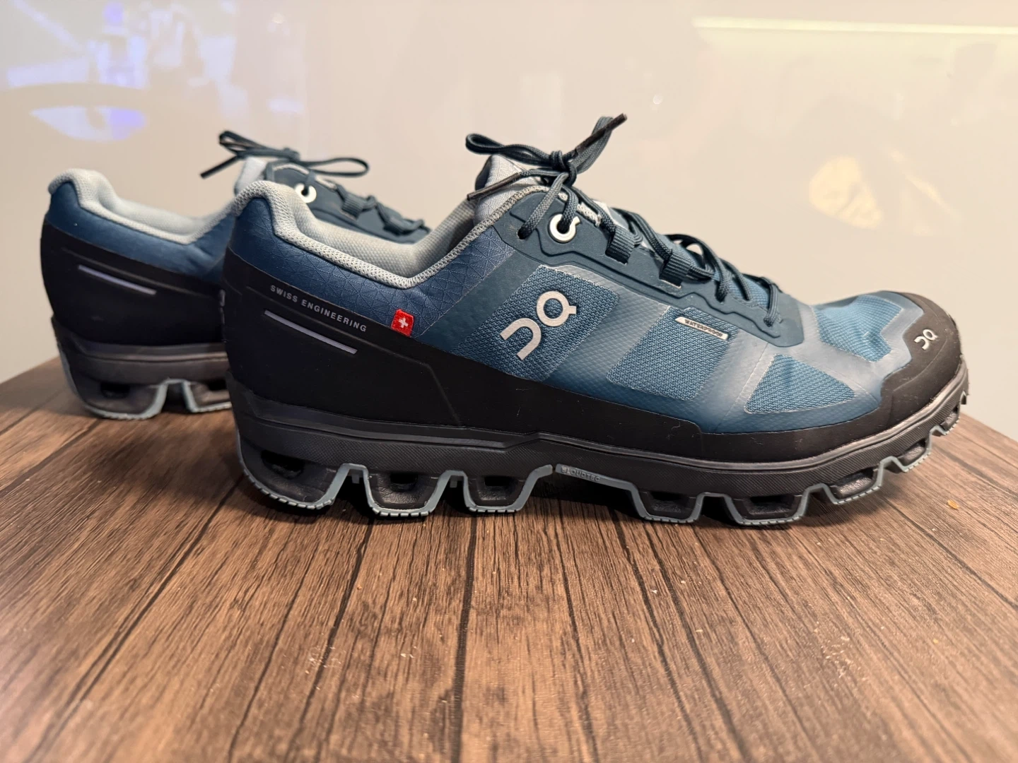 On Running Swiss Engineering trail/running shoes in blue. Waterproof, clean, well kept, and very comfortable. Soles in great shape with plenty of life left. Lightweight and breathable.
