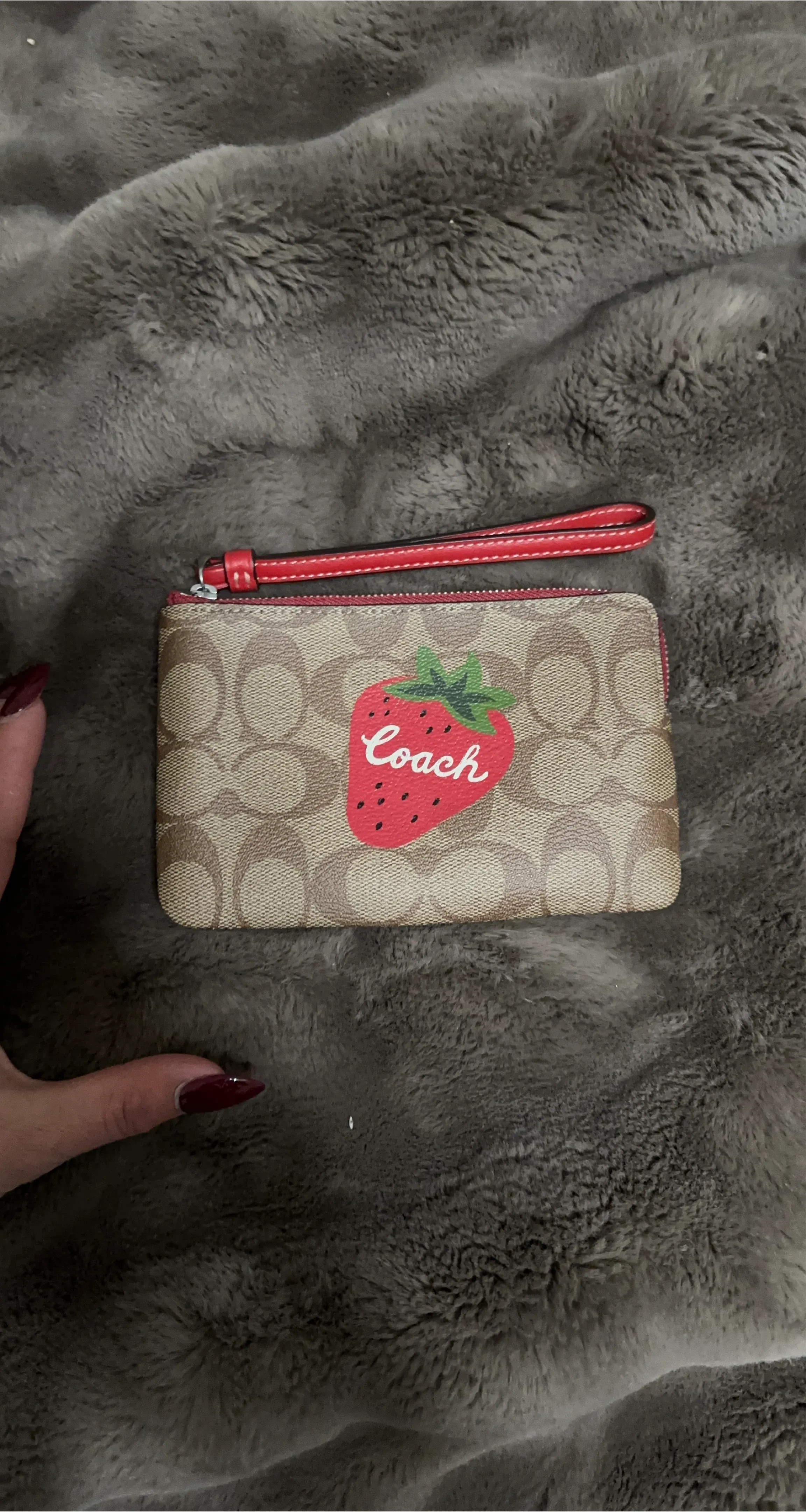 This is a Coach wristlet with the signature C pattern and a cute strawberry design. It's perfect for carrying essentials like cards and keys. Zipper closure with a red interior and a small card slot inside.