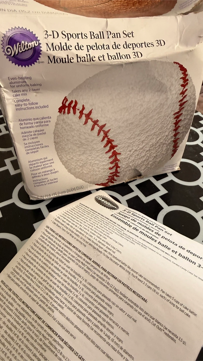 This Wilton 3-D Sports Ball Pan Set lets you bake and decorate a spherical cake, perfect for a baseball theme. It's made from even-heating aluminum for uniform baking and includes instructions. Makes one 2-layer cake.