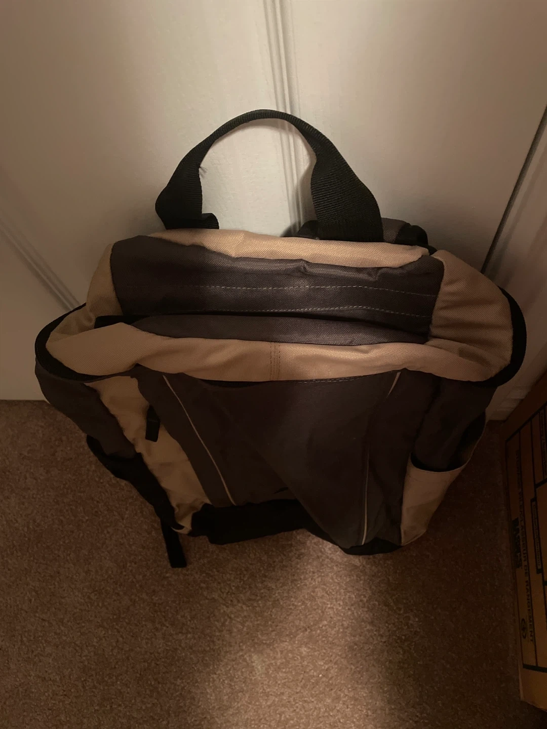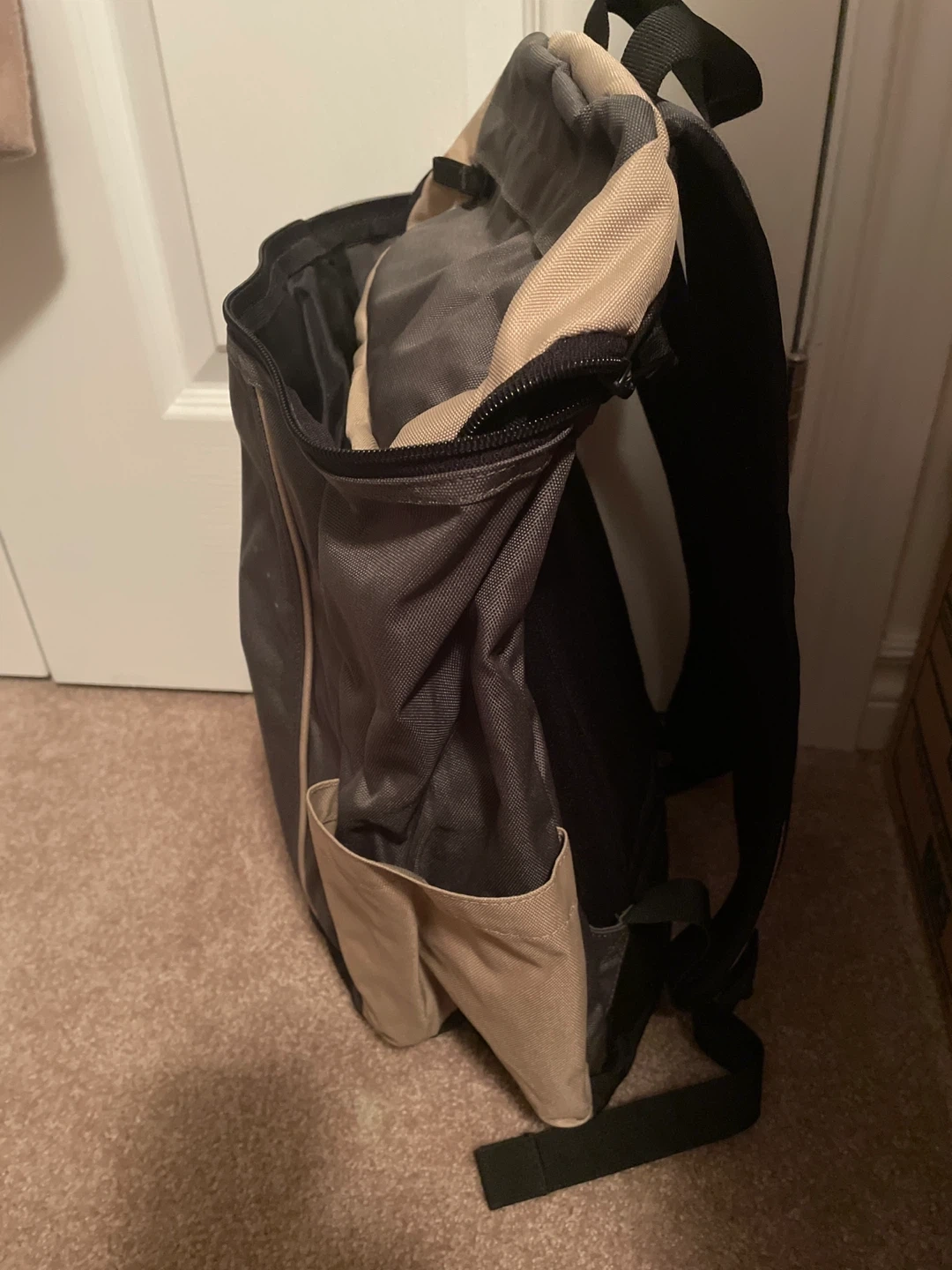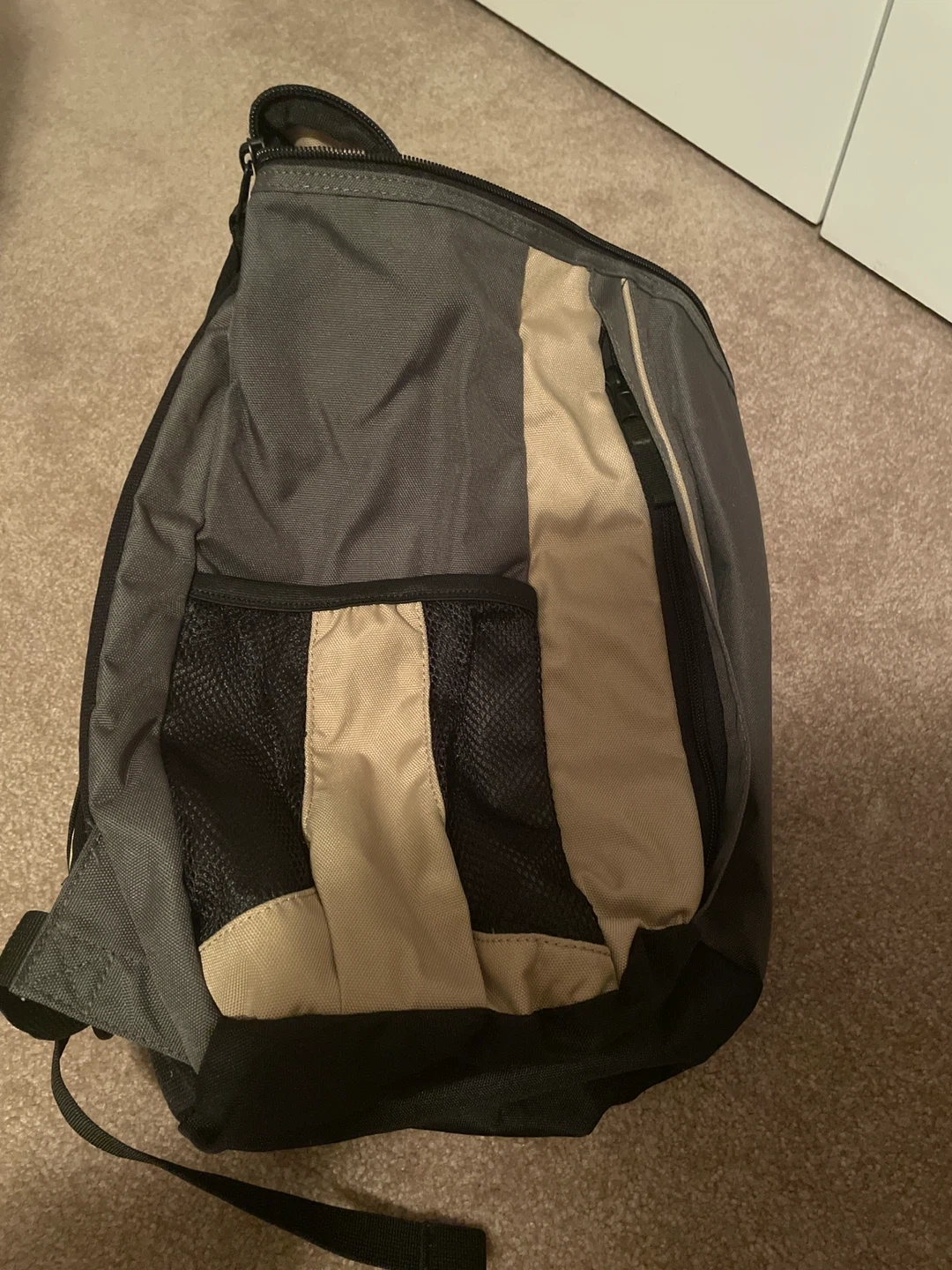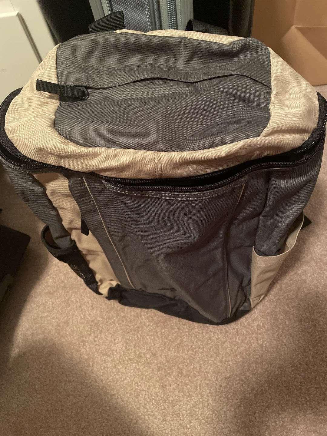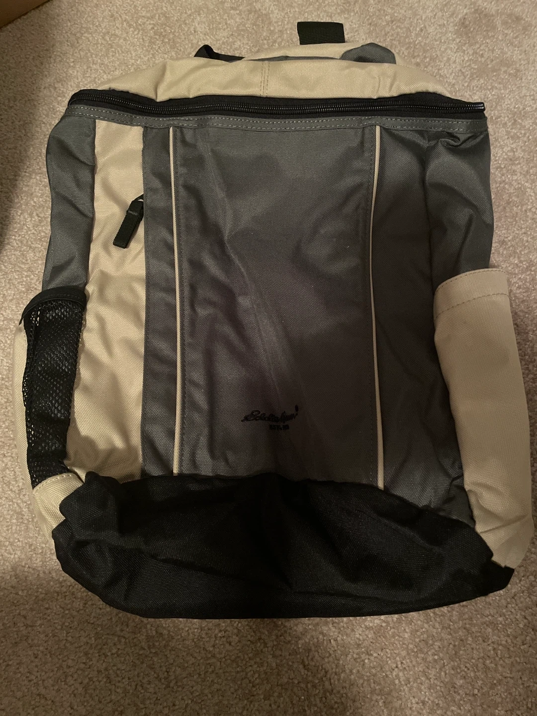This is an Eddie Bauer backpack with a beige and grey colour scheme. It features padded shoulder straps for comfort and mesh side pockets for water bottles. It's great for everyday use or short trips!