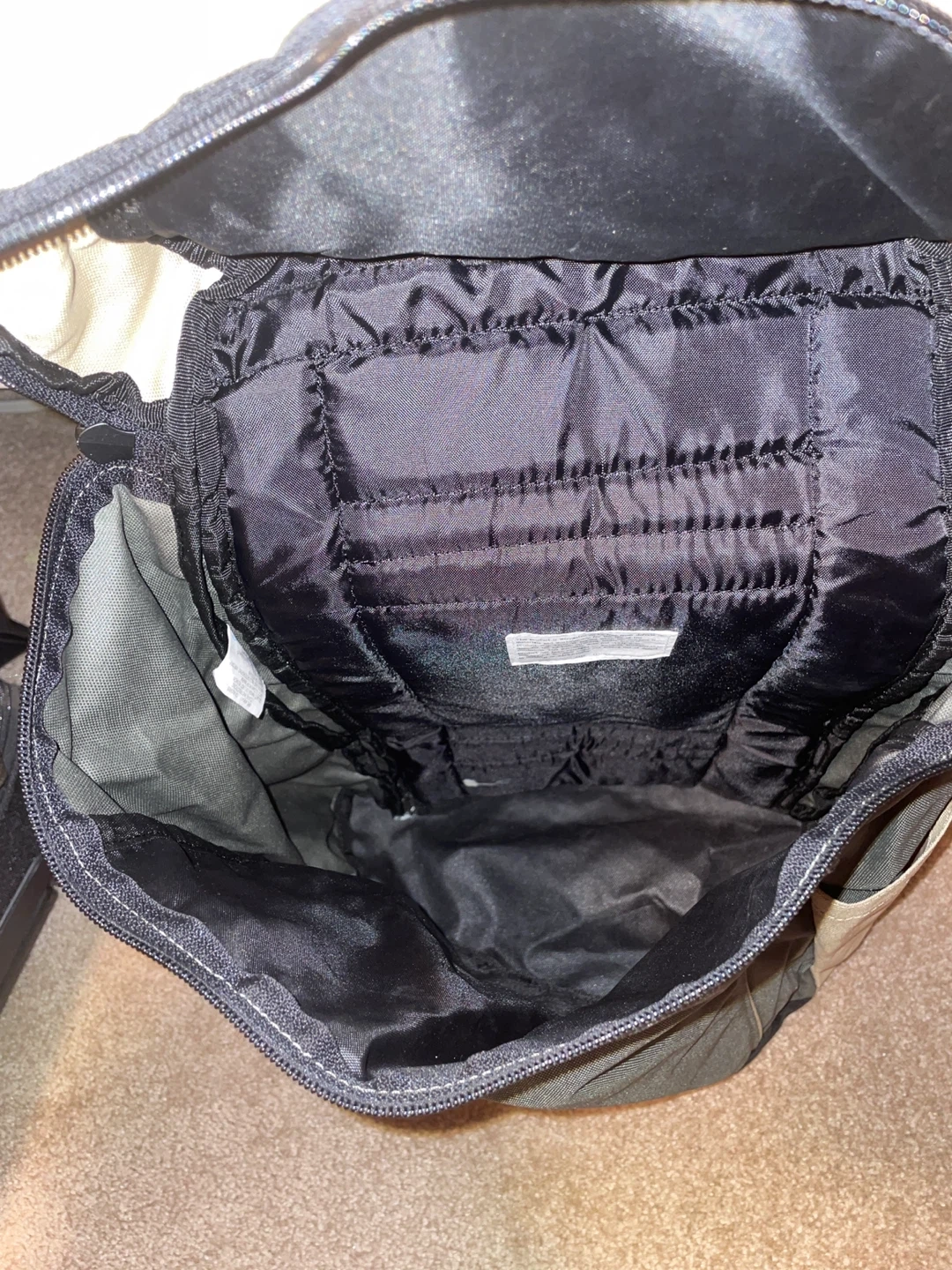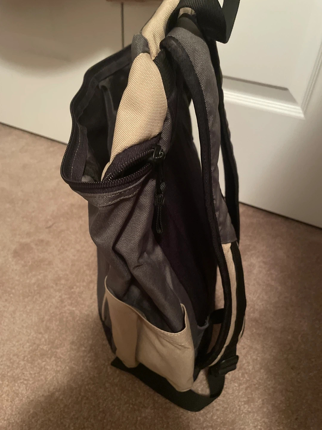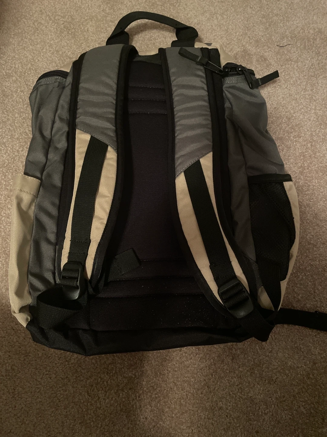 This is an Eddie Bauer backpack with a beige and grey colour scheme. It features padded shoulder straps for comfort and mesh side pockets for water bottles. It's great for everyday use or short trips!