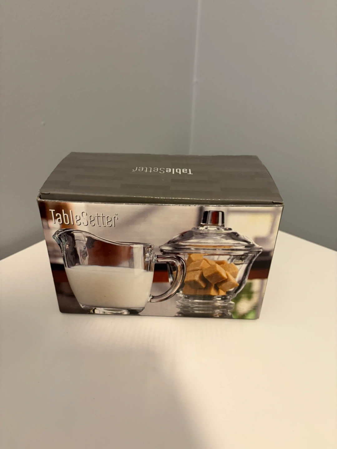 This is a TableSetter glass creamer and sugar bowl set. It includes a 6 oz creamer and a 6 oz sugar bowl with a lid. Both pieces are made of clear glass and are dishwasher safe.
