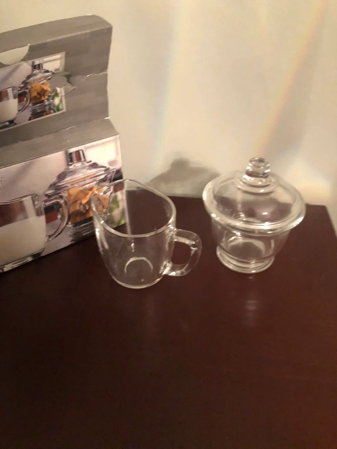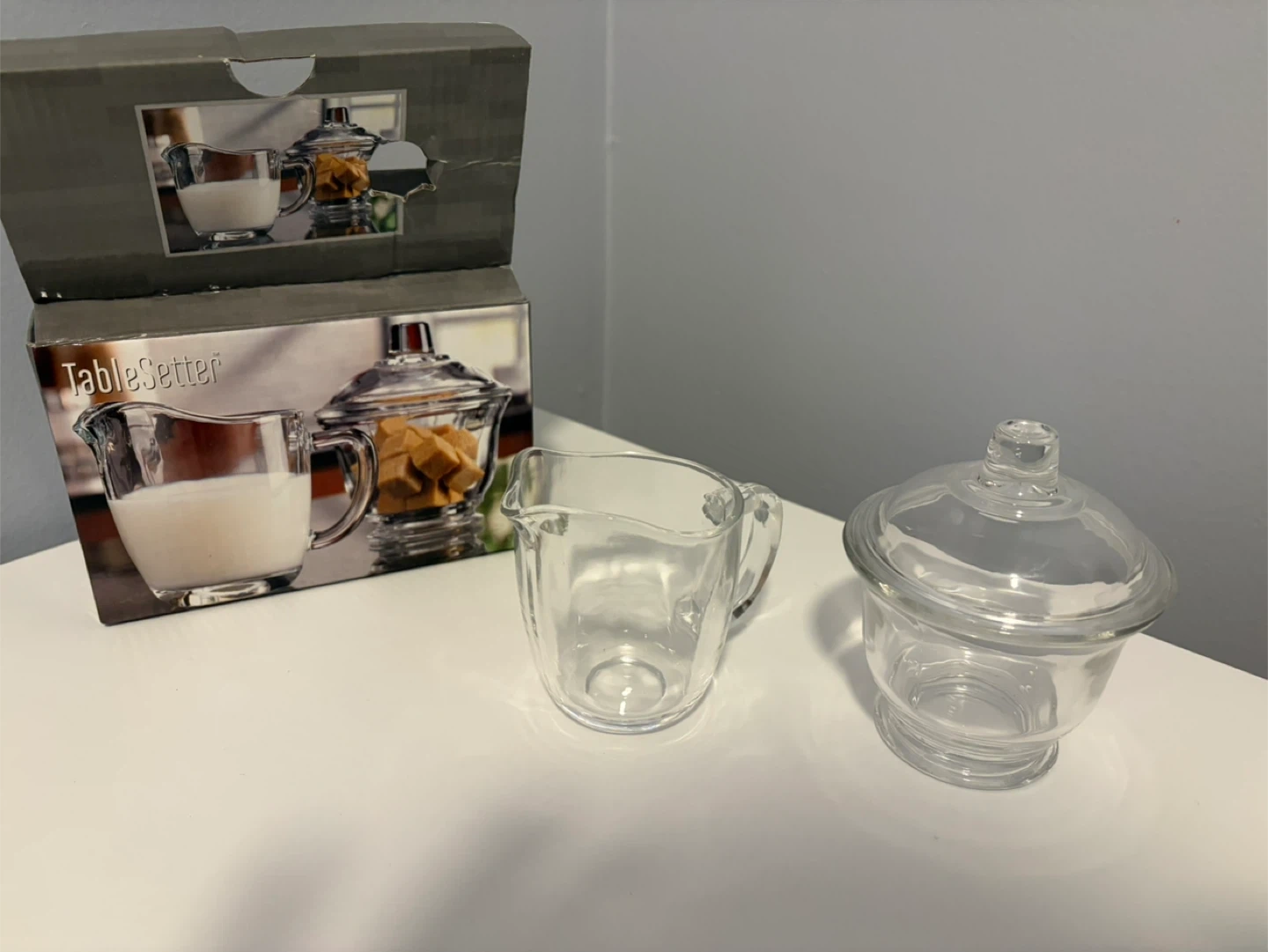 This is a TableSetter glass creamer and sugar bowl set. It includes a 6 oz creamer and a 6 oz sugar bowl with a lid. Both pieces are made of clear glass and are dishwasher safe.