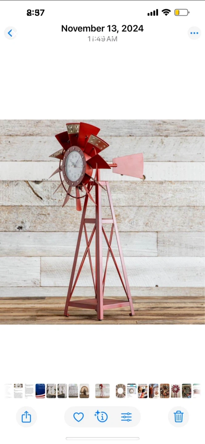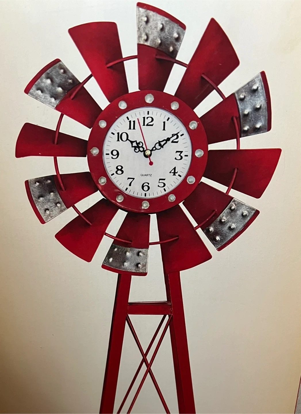 This decorative clock features a charming windmill design. It's made of metal with a distressed red finish. The clock face is white with black numerals and hands.