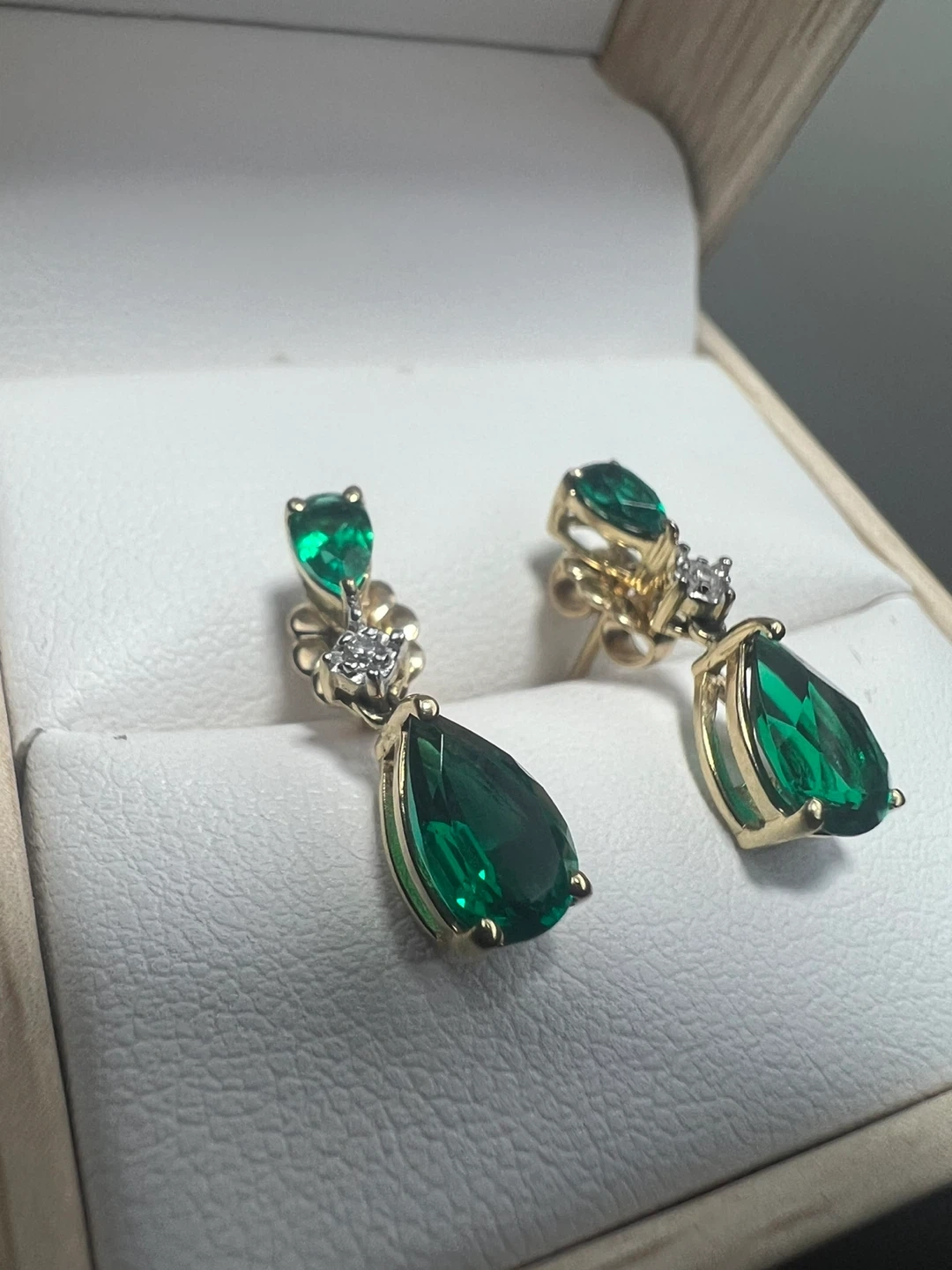 These stunning drop 10 k earrings feature pear-shaped emeralds accented with diamonds. Crafted in yellow gold, they offer a touch of elegance. Perfect for adding a pop of colour to any occasion!