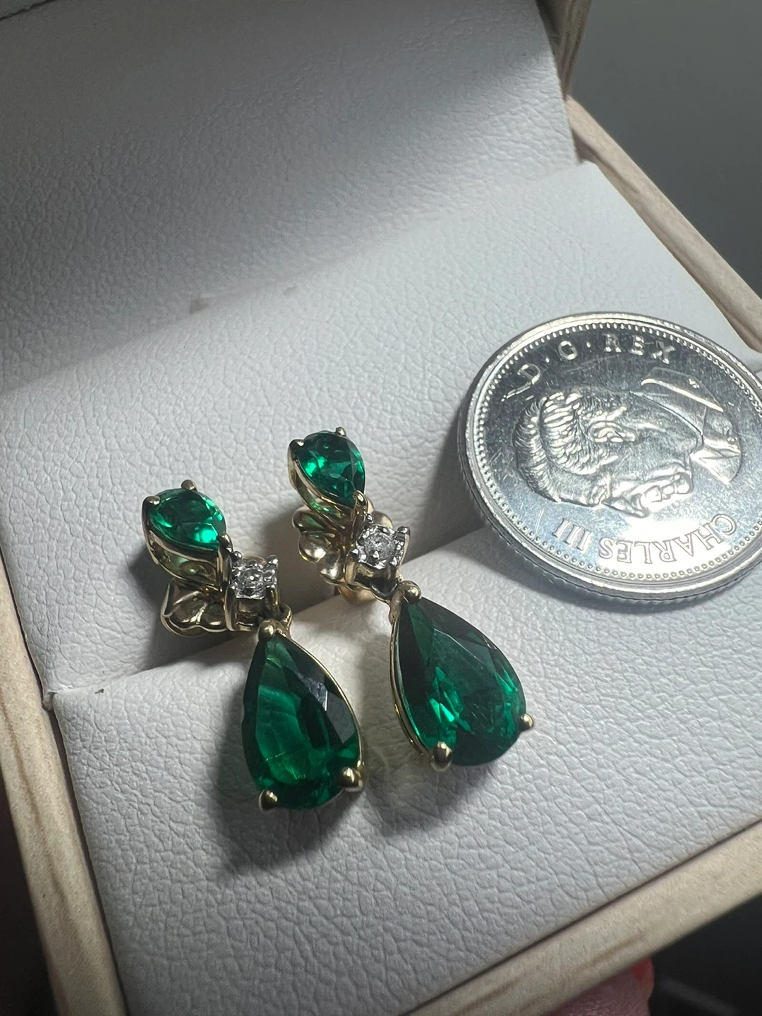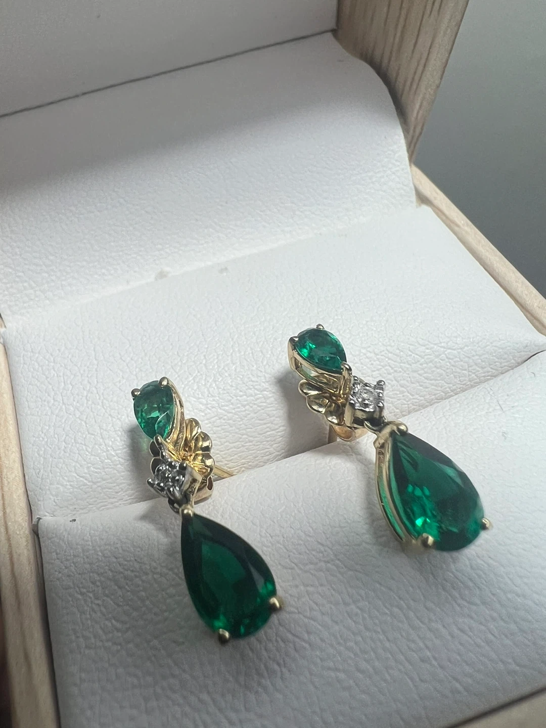 These stunning drop 10 k earrings feature pear-shaped emeralds accented with diamonds. Crafted in yellow gold, they offer a touch of elegance. Perfect for adding a pop of colour to any occasion!