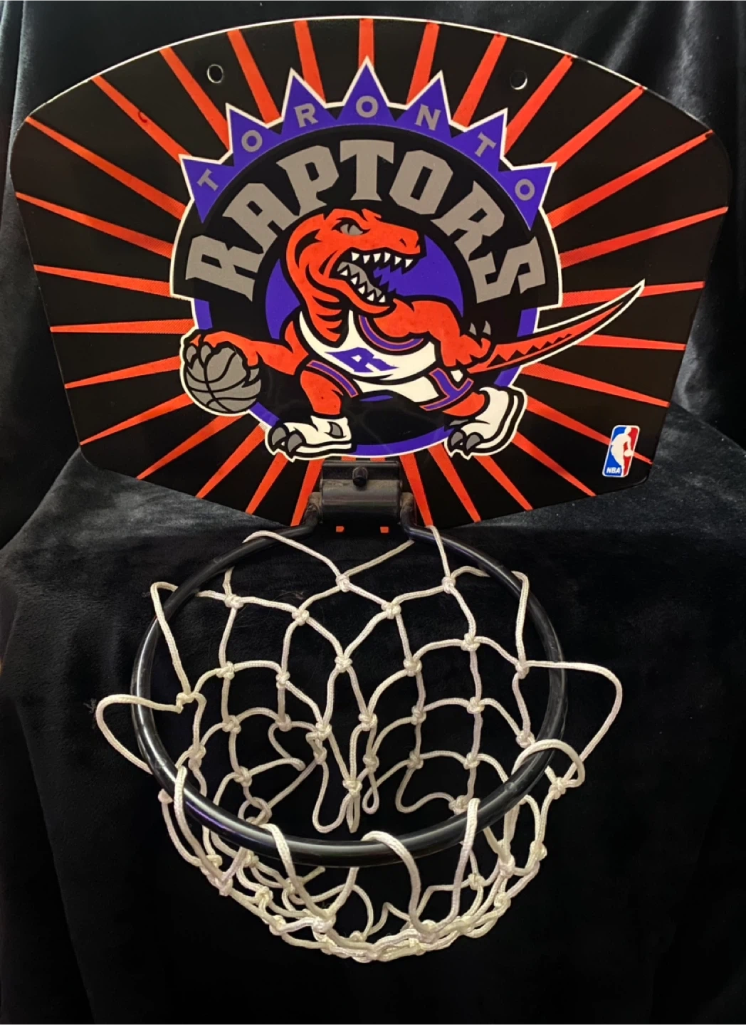 This mini basketball hoop features the Toronto Raptors logo and mascot. It's perfect for fans who want to bring a bit of NBA excitement home. Comes with a net. To mount you can use 2 way tape or screw it in to wall or door.