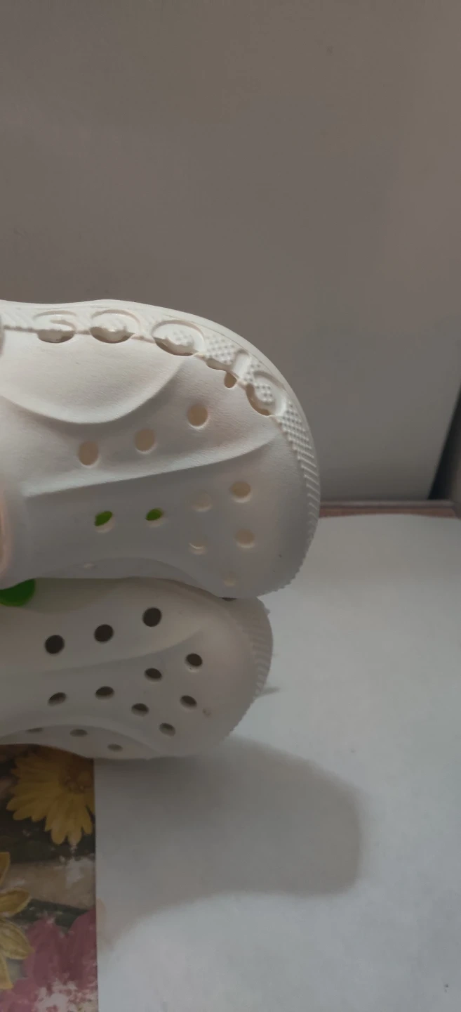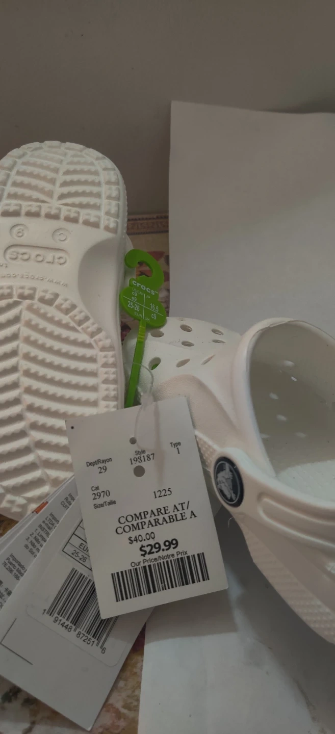 These are white Crocs in kids size 9. They're made of Croslite material and have the classic Crocs design. Great for casual wear!