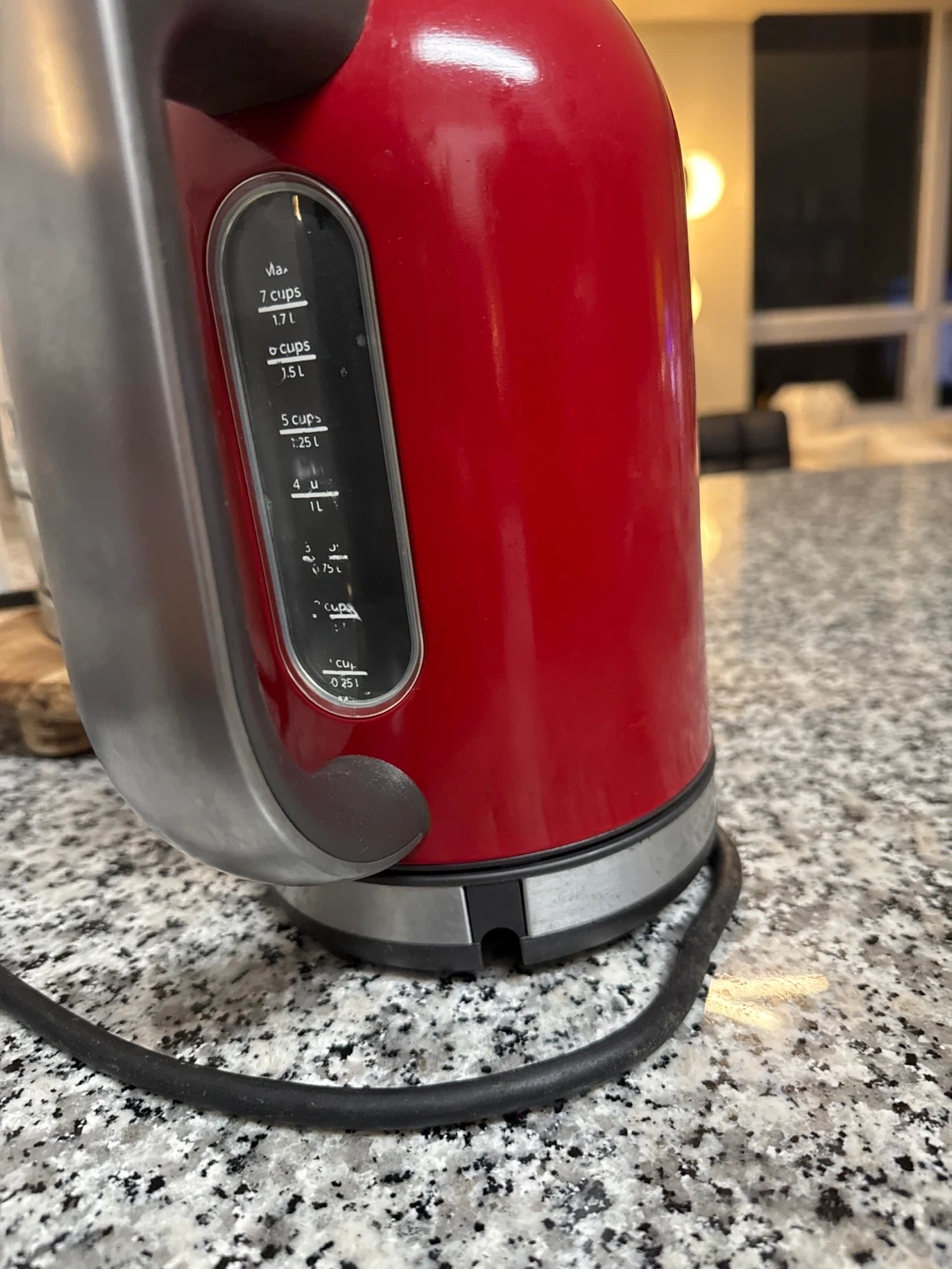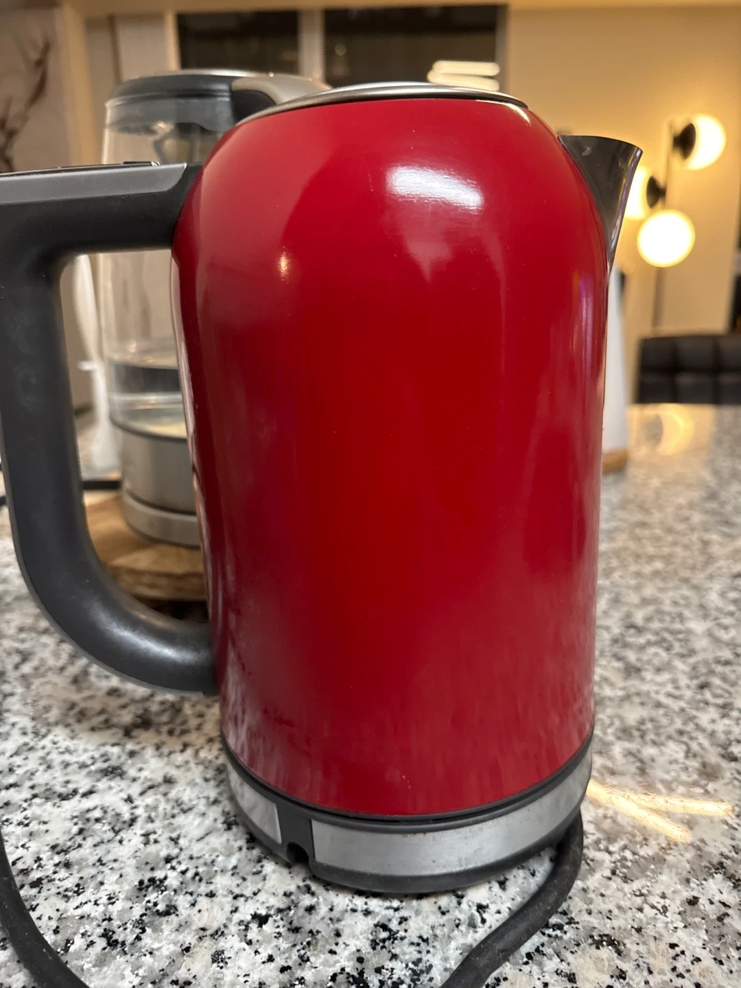 Red KitchenAid electric kettle with temperature control. Holds up to 7 cups or 1.7L. Perfect for quickly heating water for beverages or cooking.