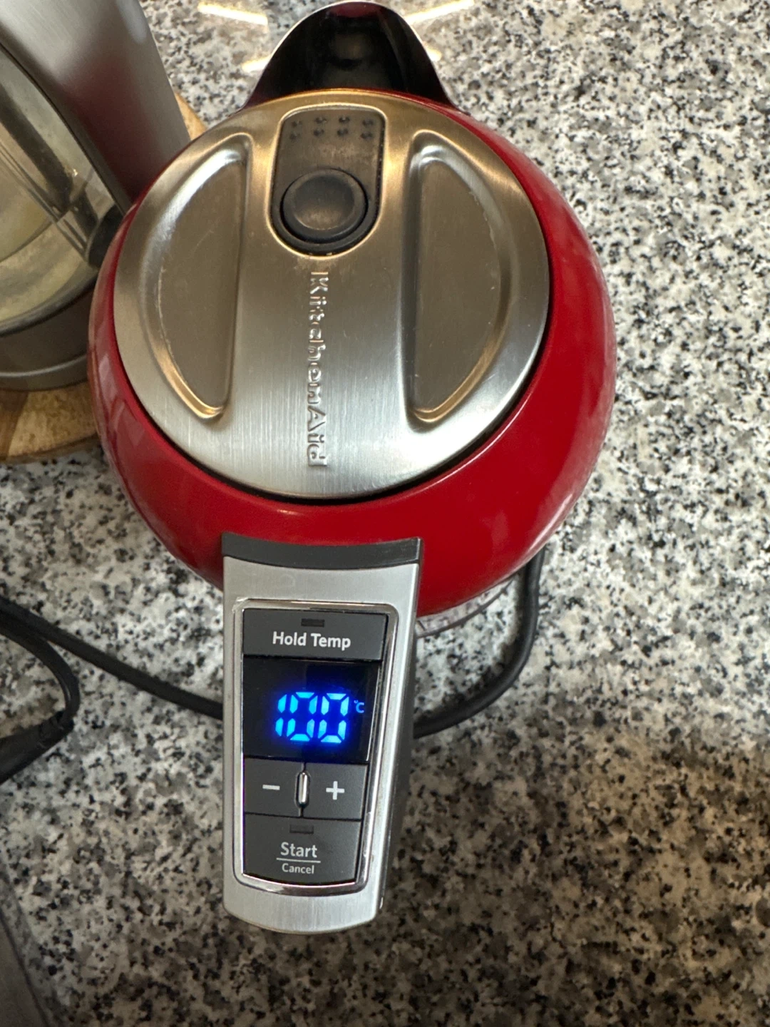 Red KitchenAid electric kettle with temperature control. Holds up to 7 cups or 1.7L. Perfect for quickly heating water for beverages or cooking.