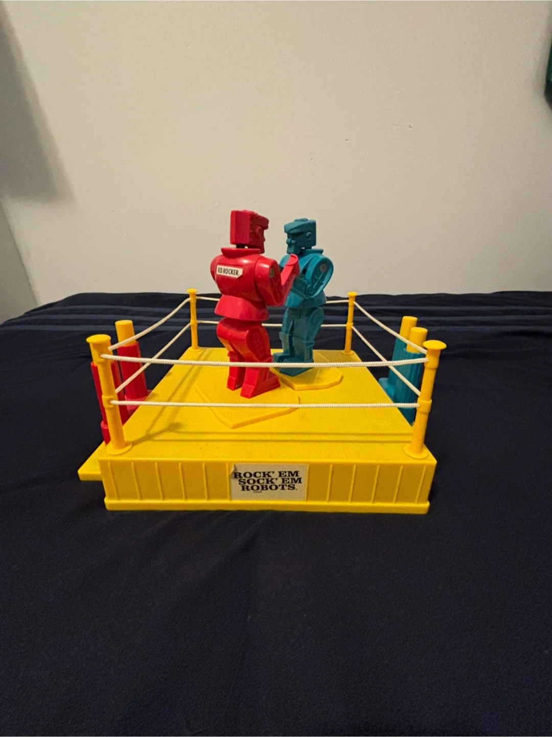 Classic Rock 'Em Sock 'Em Robots game featuring red and blue robots. The game board is yellow with red and blue corner posts and white ropes. This toy provides hours of competitive fun! It's a great item for collectors or for a fun game night.