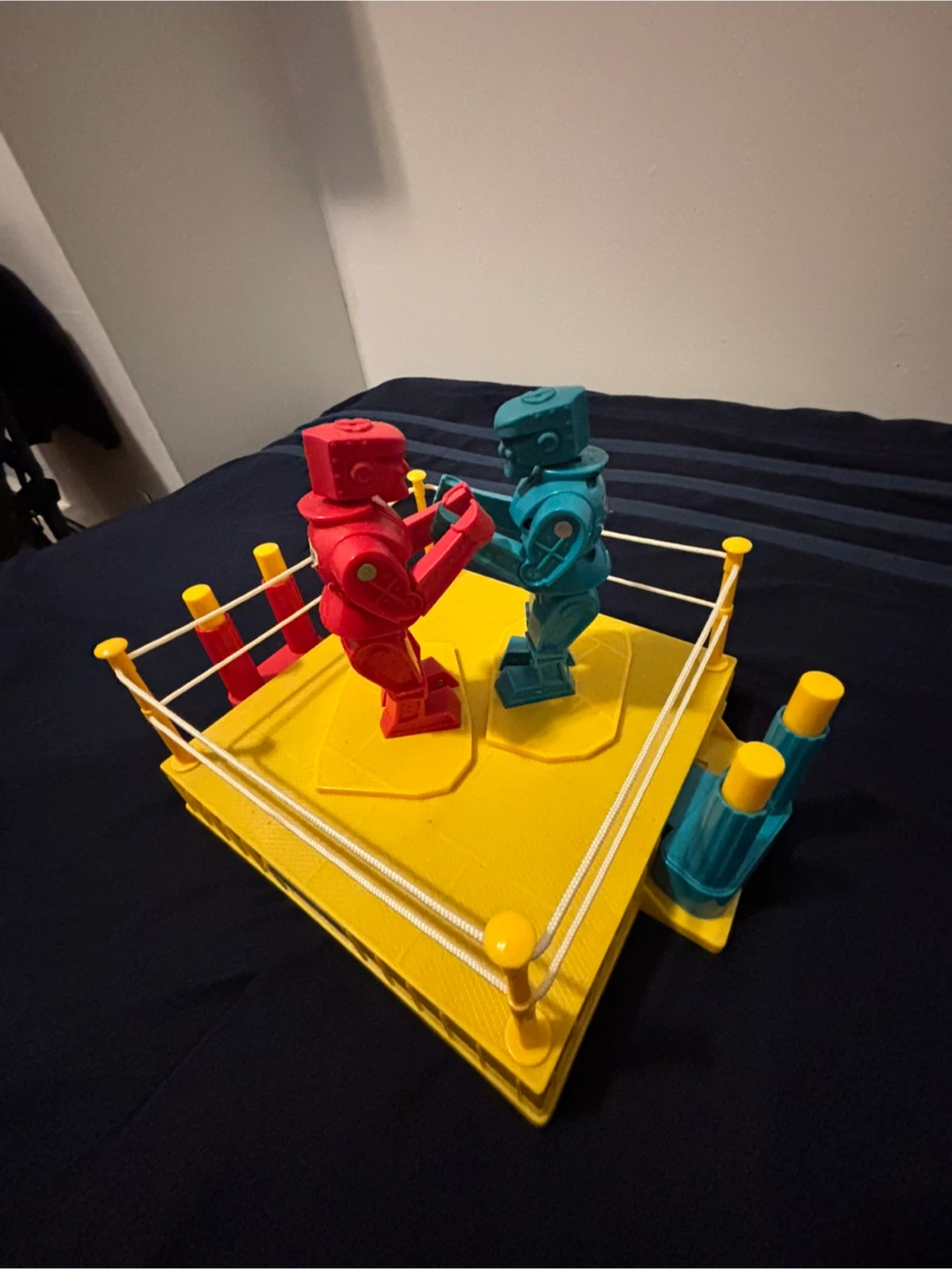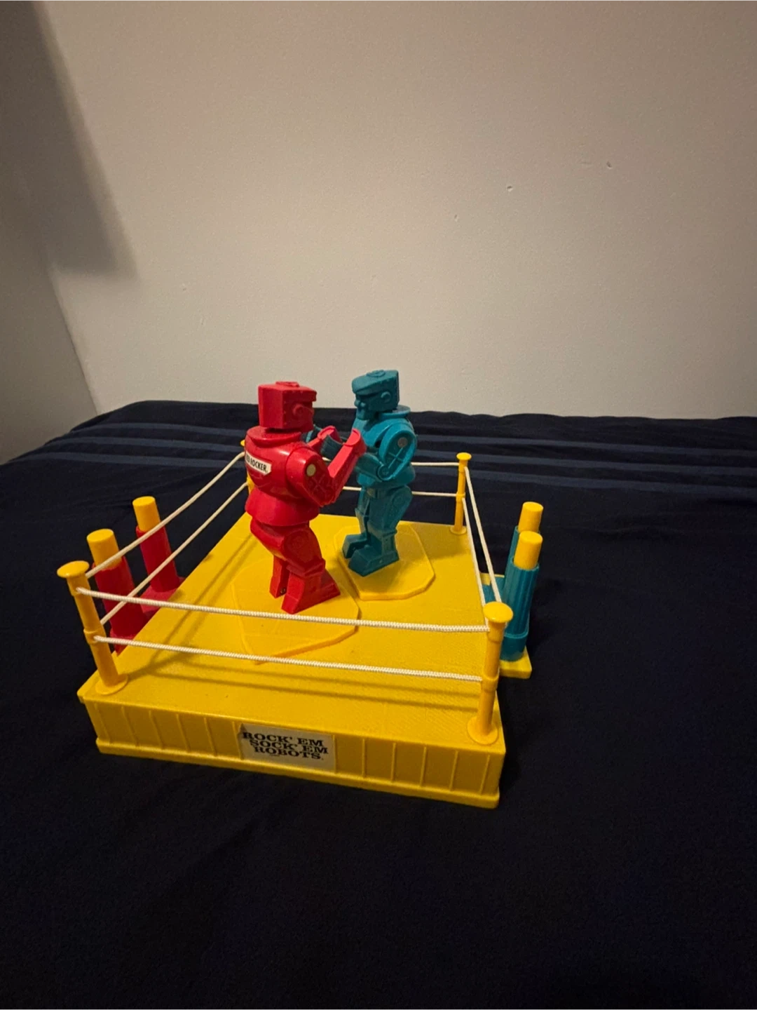 Classic Rock 'Em Sock 'Em Robots game featuring red and blue robots. The game board is yellow with red and blue corner posts and white ropes. This toy provides hours of competitive fun! It's a great item for collectors or for a fun game night.