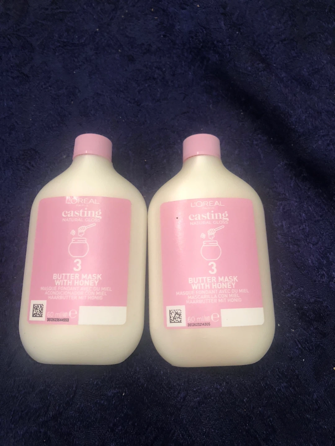 Giving away 2 bottles of L'Oréal Casting Butter Mask with Honey. Each bottle contains 60ml of hair treatment. This mask is designed to condition hair. Left over from hair colour kit. Unopened.