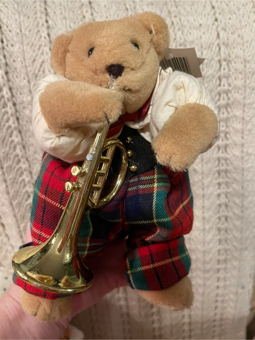 This plush bear is dressed in a festive outfit, complete with a tartan pattern. It's holding a shiny golden trumpet and plays music. A cute decorative piece! Regular price was $24.
