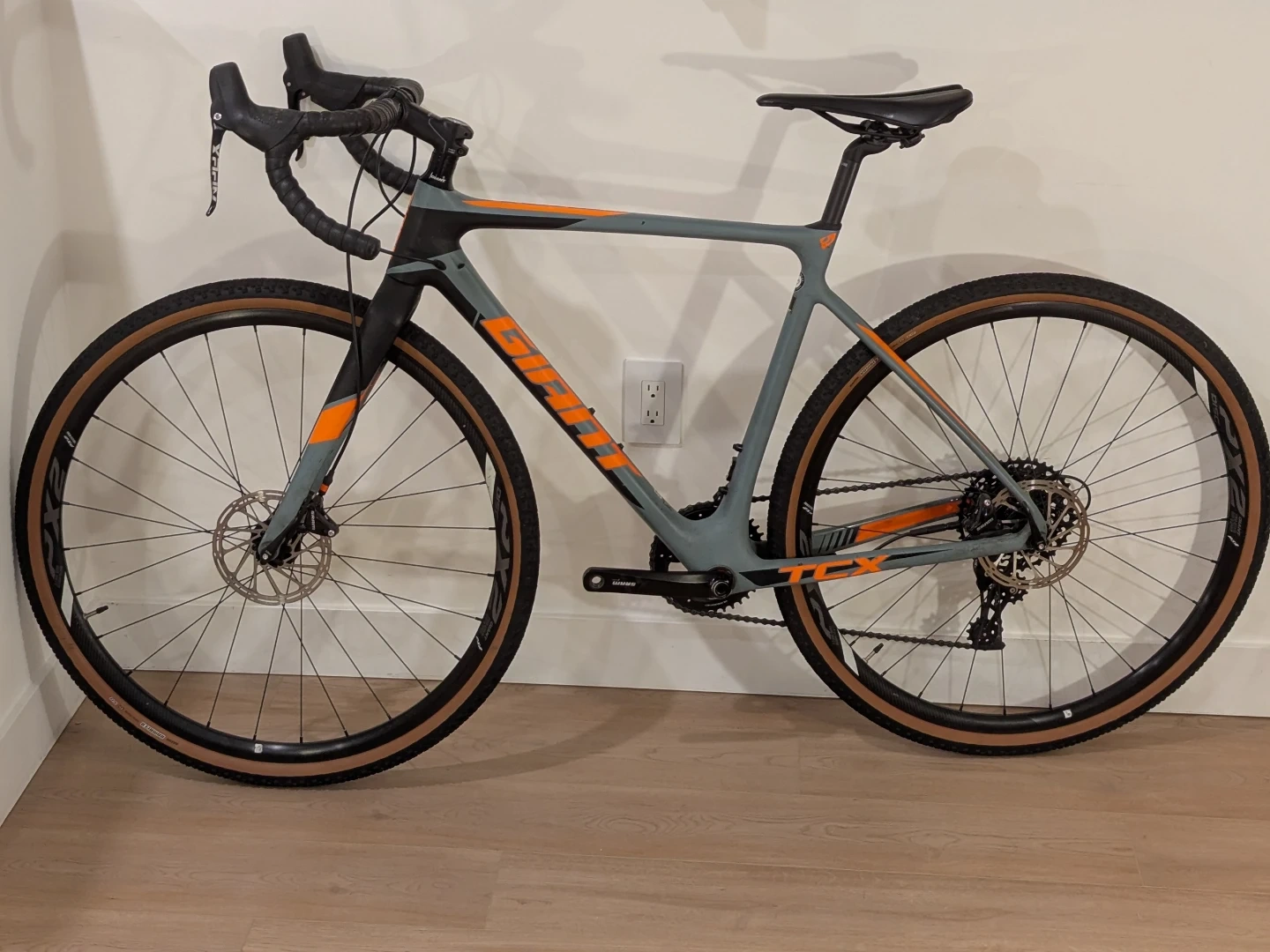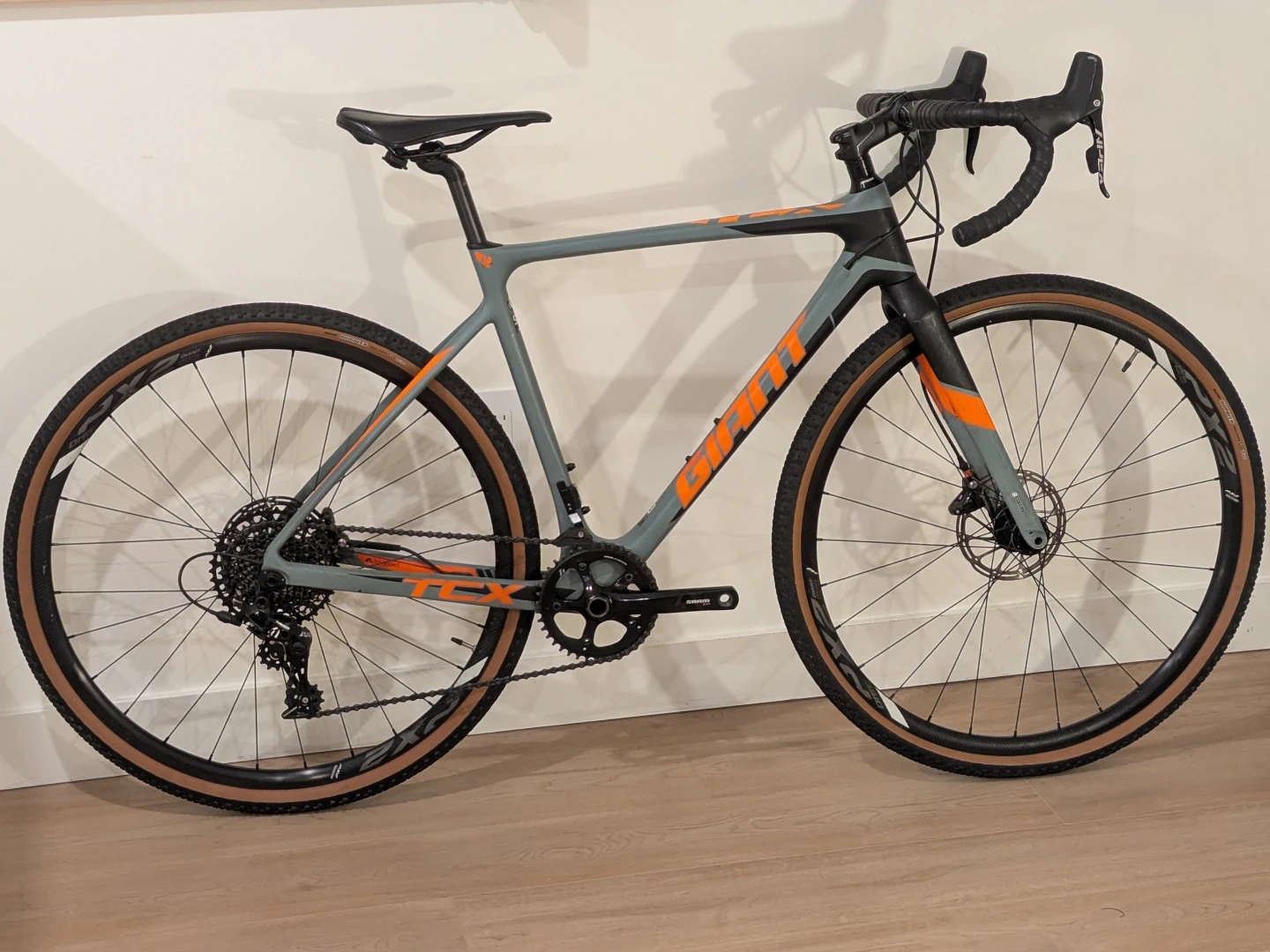 This is a 1x11 Carbon Giant TCX Advanced SX gravel bike, featuring a SRAM Apex 1 groupset and Maxxis Rambler tires. The tires are basically new. It's a fantastic cyclocross and gravel riding machine. Its lightweight carbon frame makes for an agile and responsive ride.