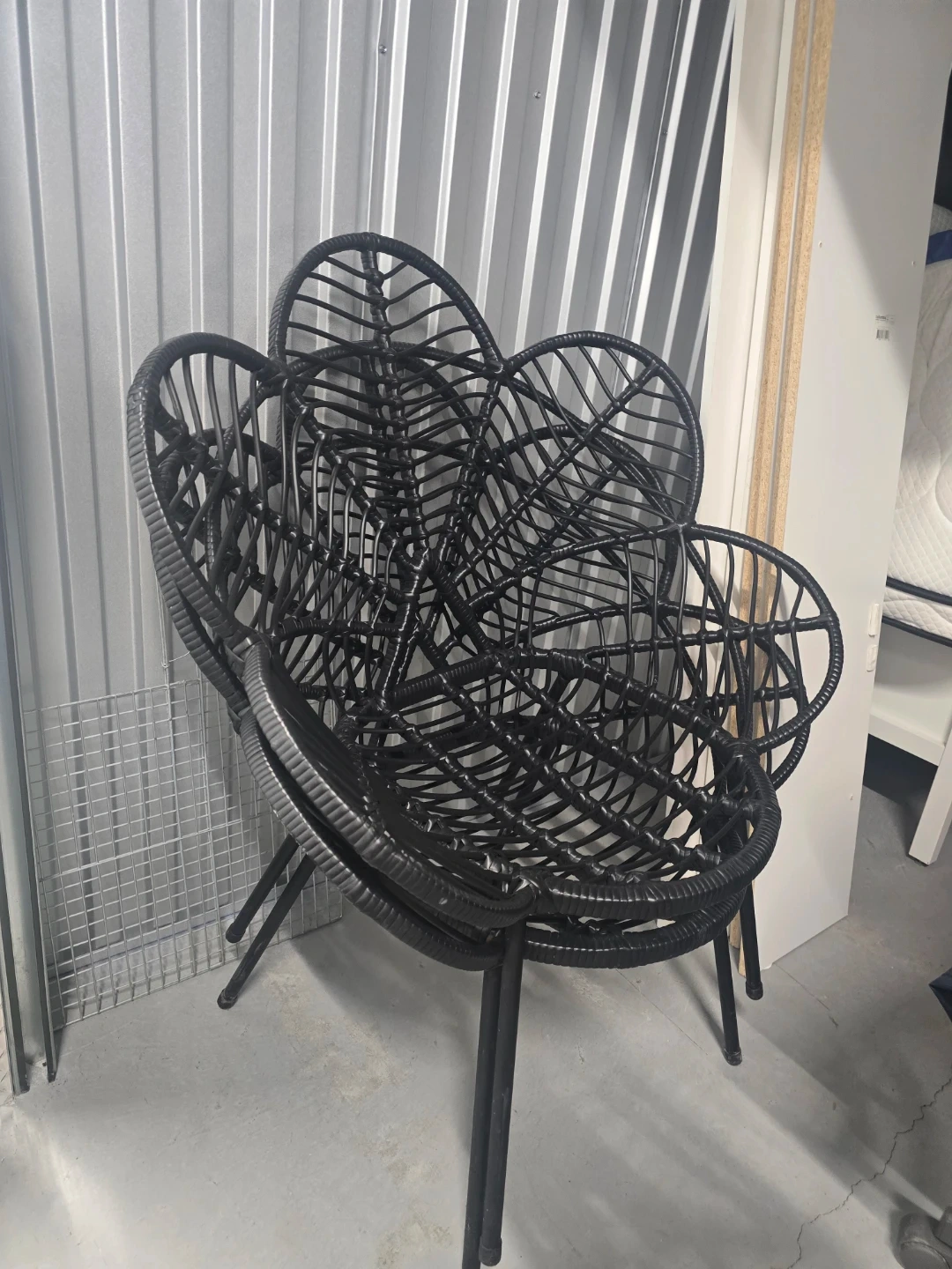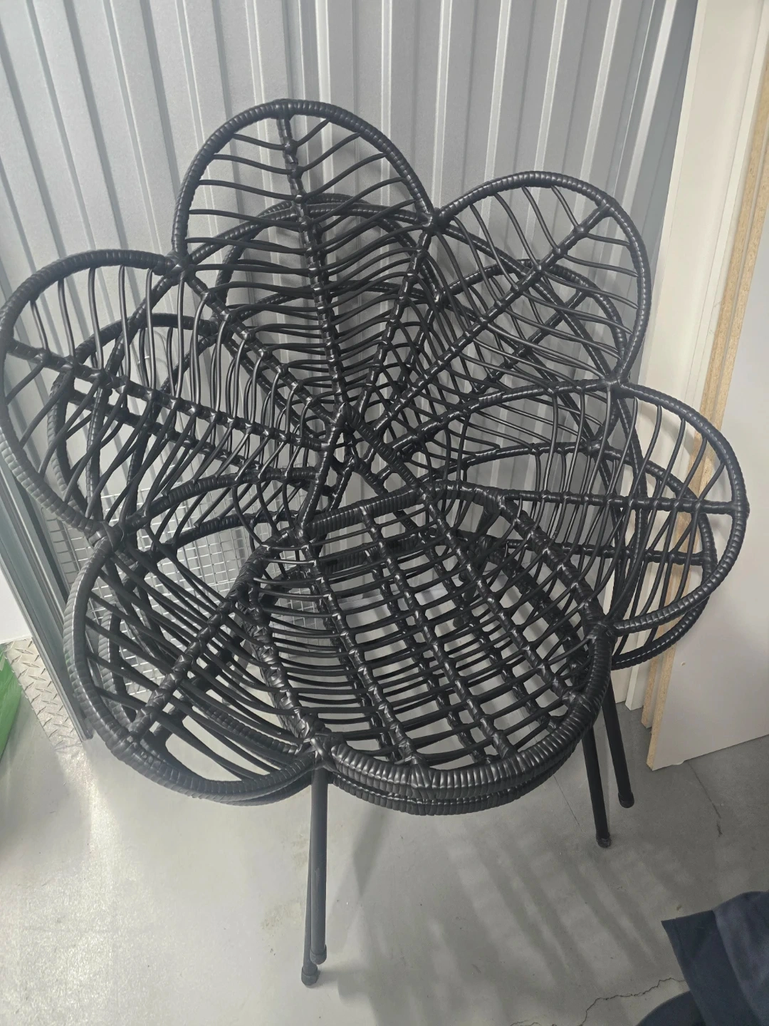 A unique black wicker chair with a flower-shaped backrest. It's made of durable wicker material. This chair adds a stylish touch to any indoor or outdoor space!