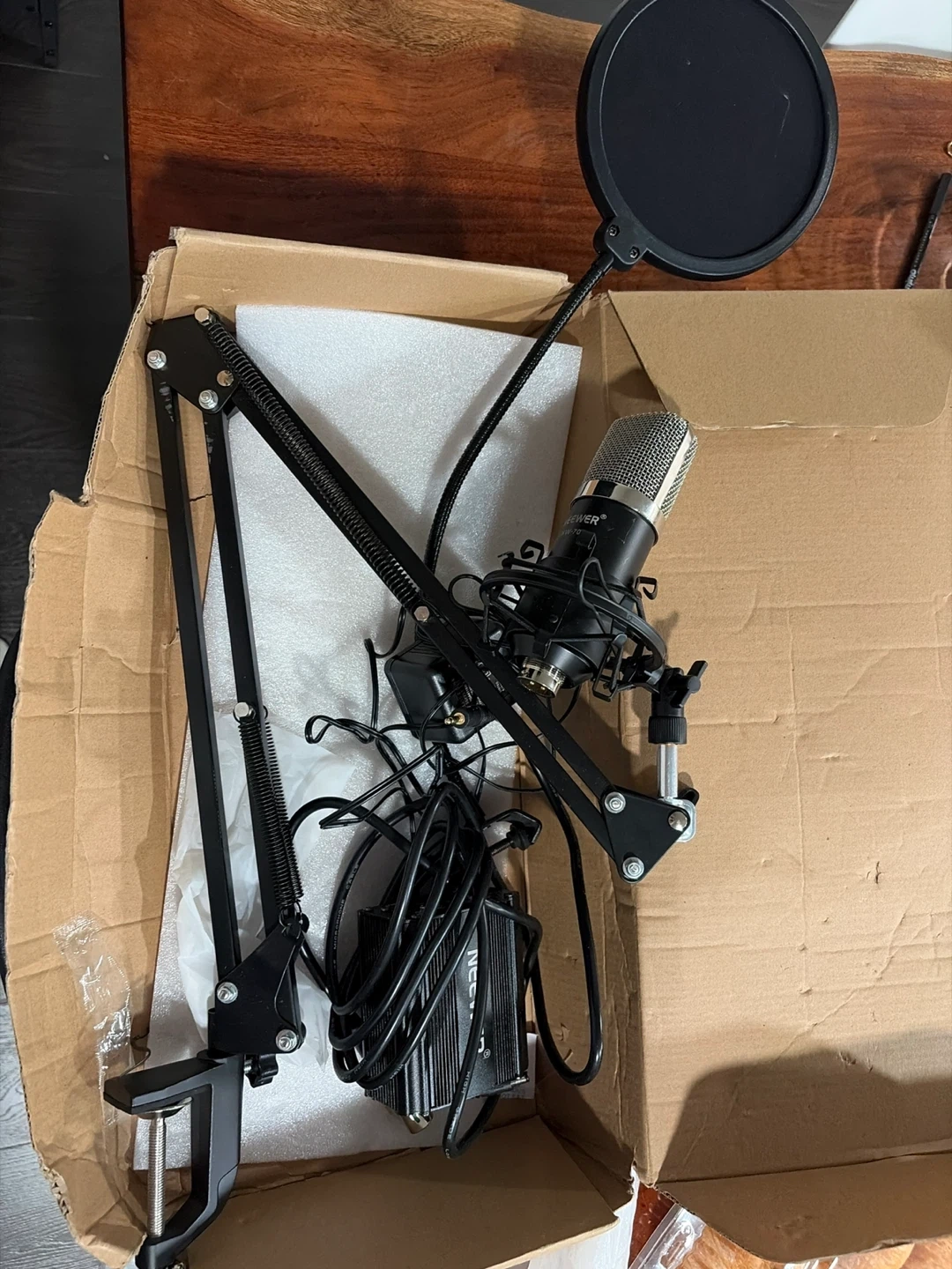 This is a Neewer NW-700 condenser microphone kit. It comes with a boom arm and a pop filter for convenient use. The microphone is black and designed for clear audio recording.