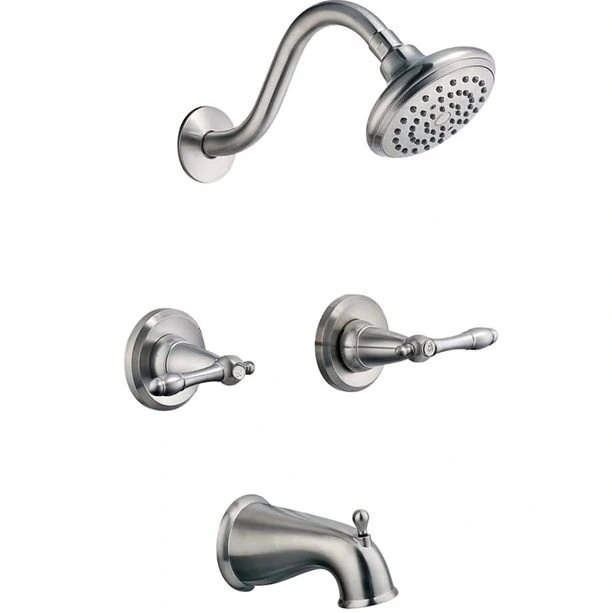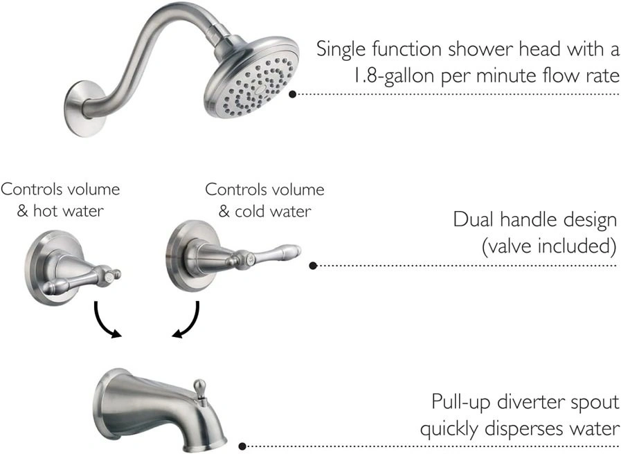 Features a dual handle design to adjust the temperature in your bathtub. Features a satin nickel finish and a washerless cartridge. Single function shower head has a 2.0-gallon per minute flow rate which ensures a steady water flow after years of everyday use and is UPC and cUPC compliant. Pull-up diverter spout will quickly disperse water.