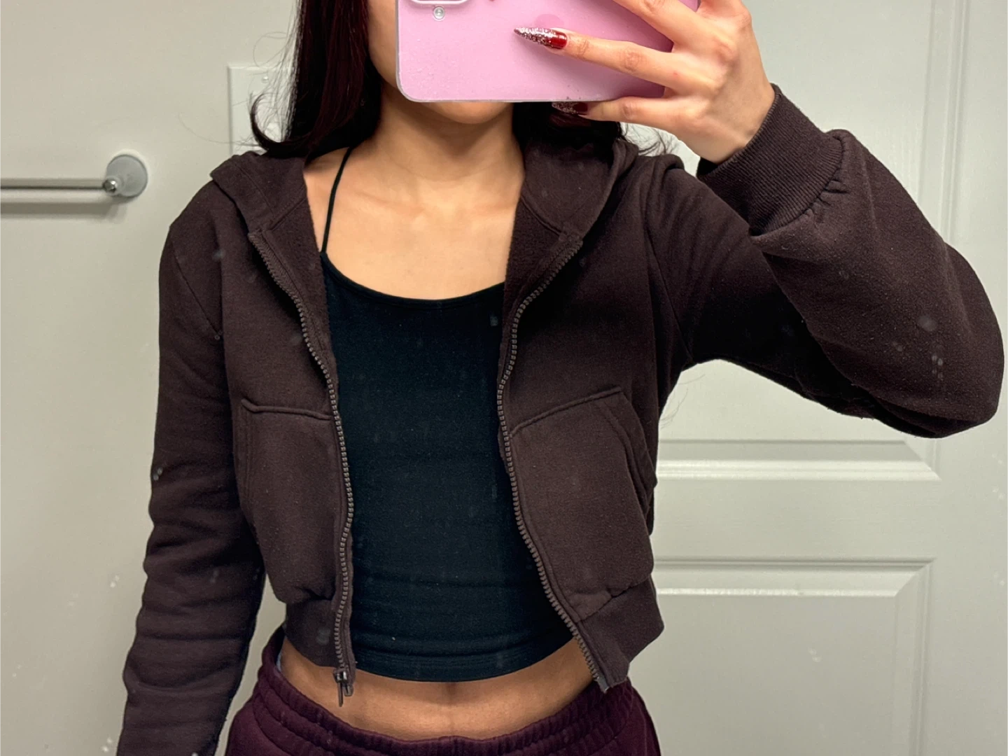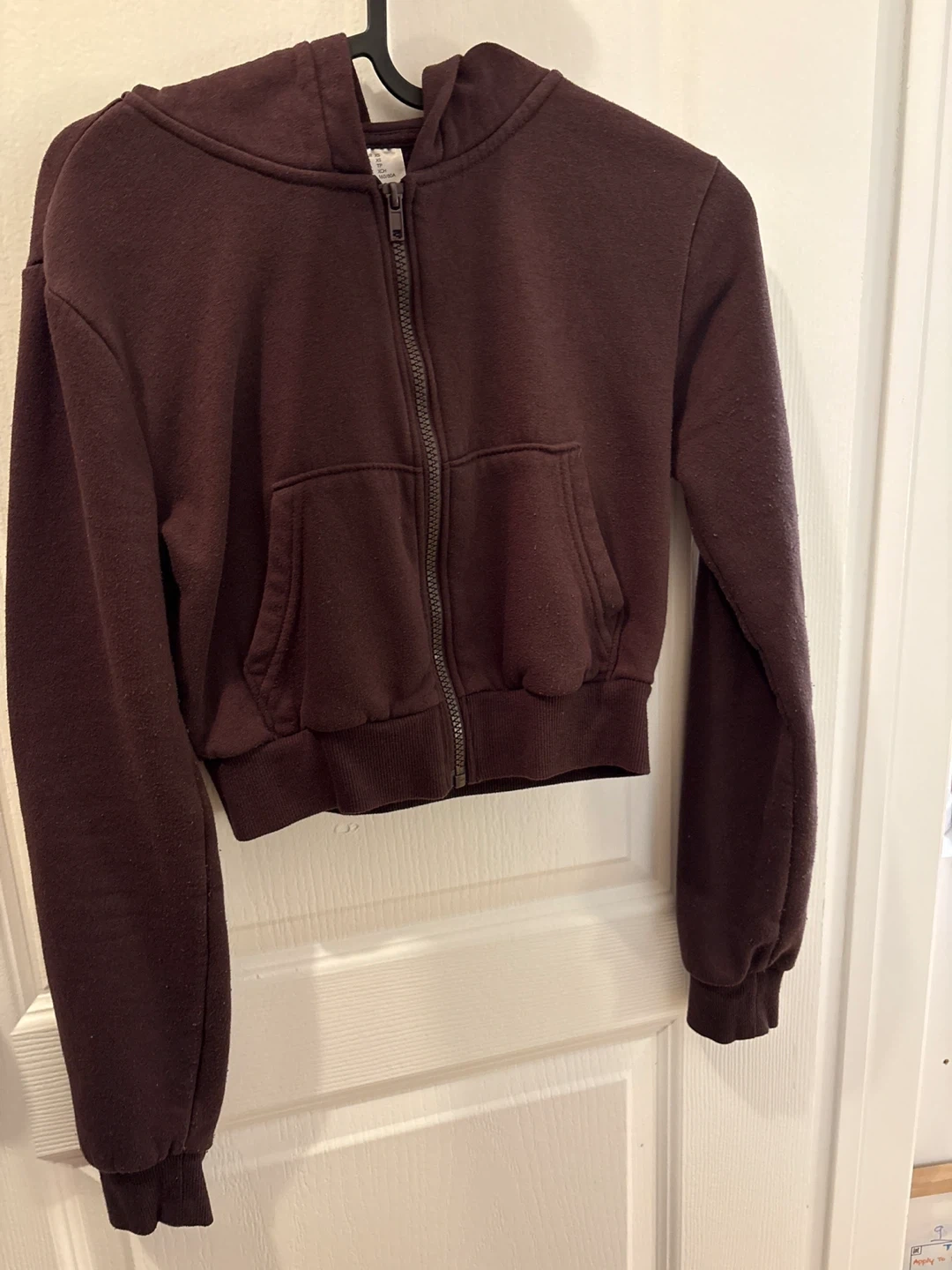 This cropped zip-up hoodie comes in a deep brown colour. It's made from a soft, comfortable fabric and features a full zipper closure and front pouch pockets. The elasticized cuffs and hem offer a snug fit.