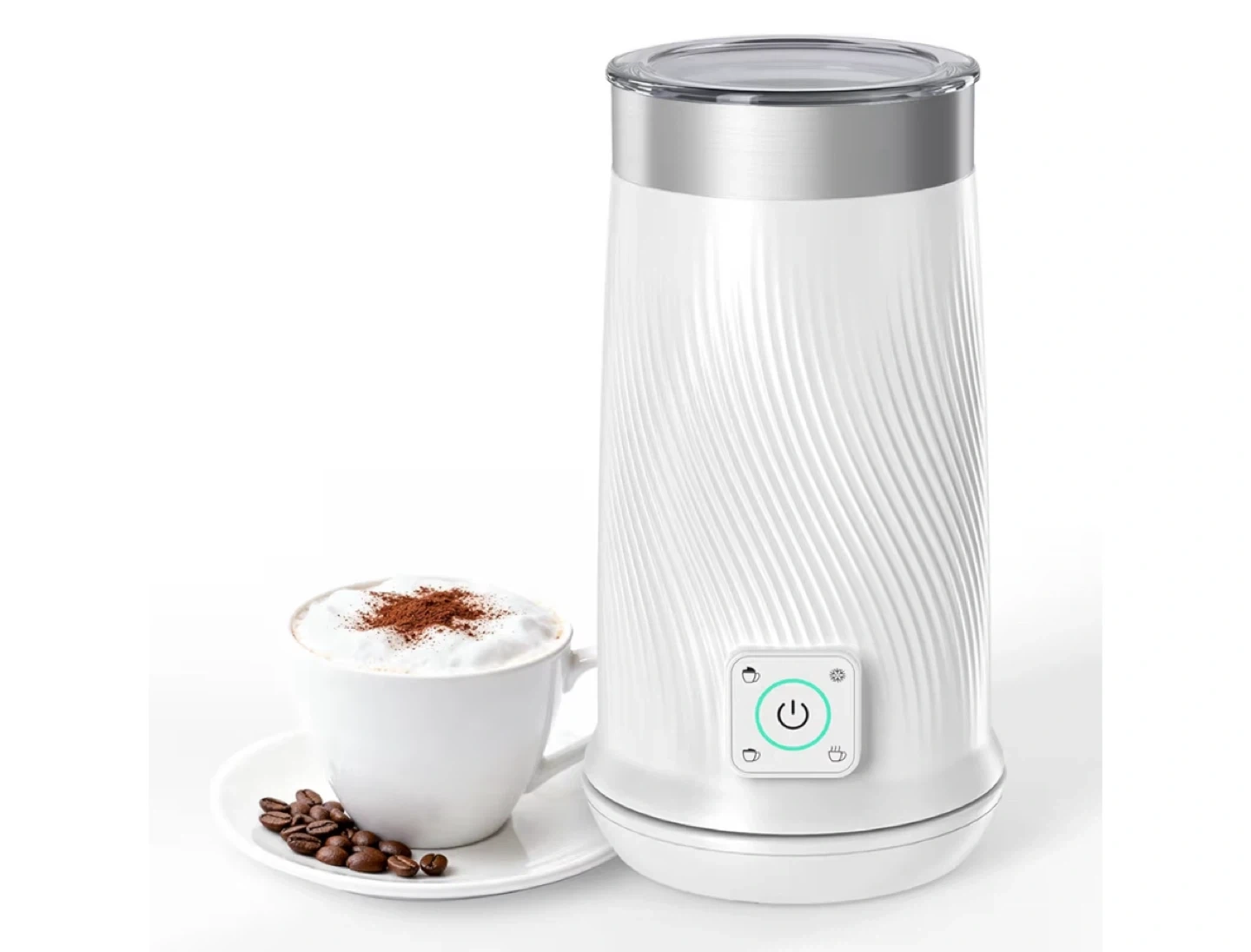 This is a WOWTEAM 4-in-1 electric milk frother. It makes enough for two average cups, perfect for lattes, cappuccinos, hot milk, hot chocolate, and iced coffee. Features include one-button operation and automatic shut-off.