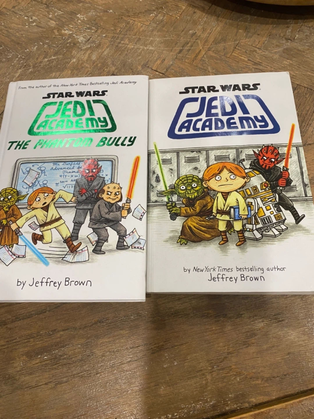 Two Star Wars Jedi Academy books by Jeffrey Brown. Includes 'The Phantom Bully' and another title. One is hardcover and the other is a paperback. In new, never read condition.