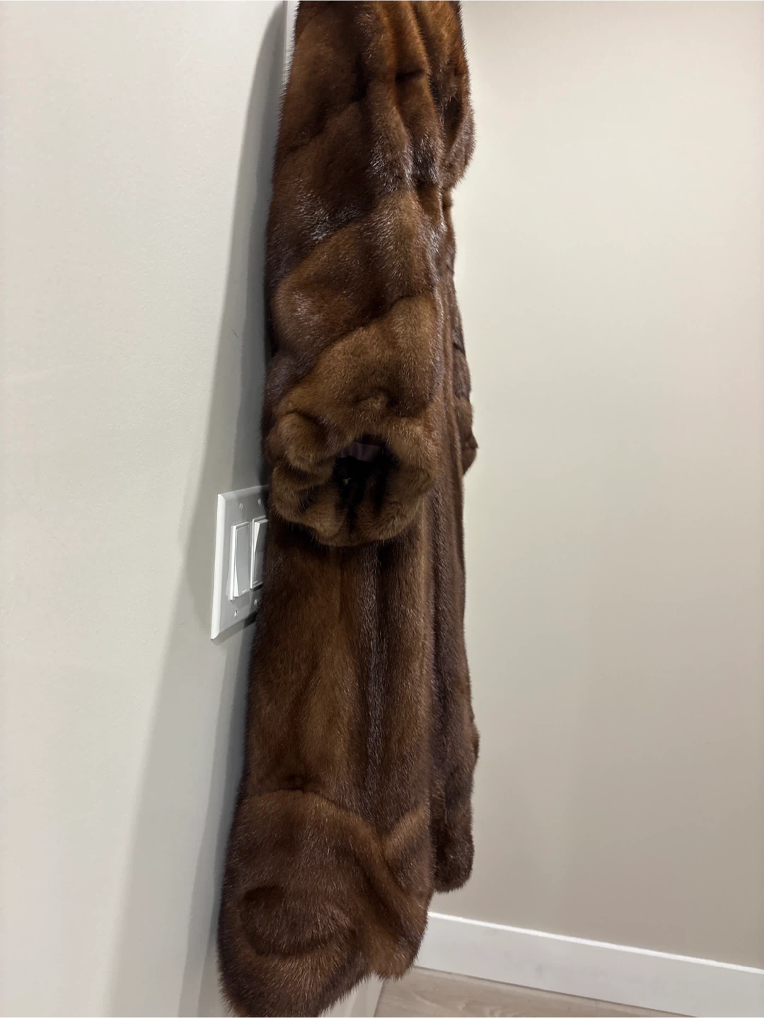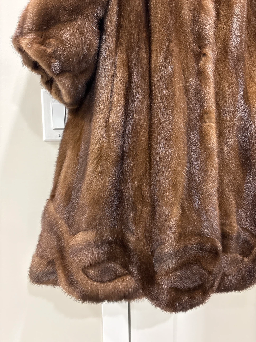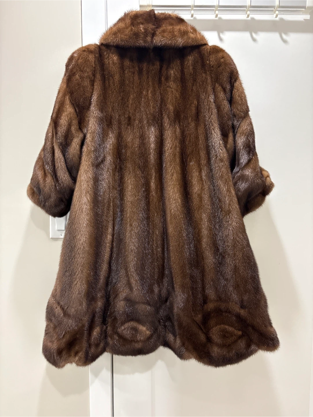 A luxurious brown mink fur coat. It has a classic collar and three-quarter sleeves. This coat is perfect for staying warm and stylish on cooler days!