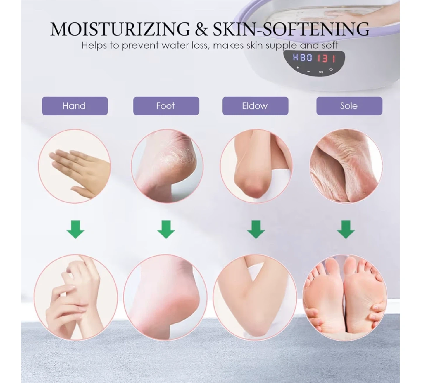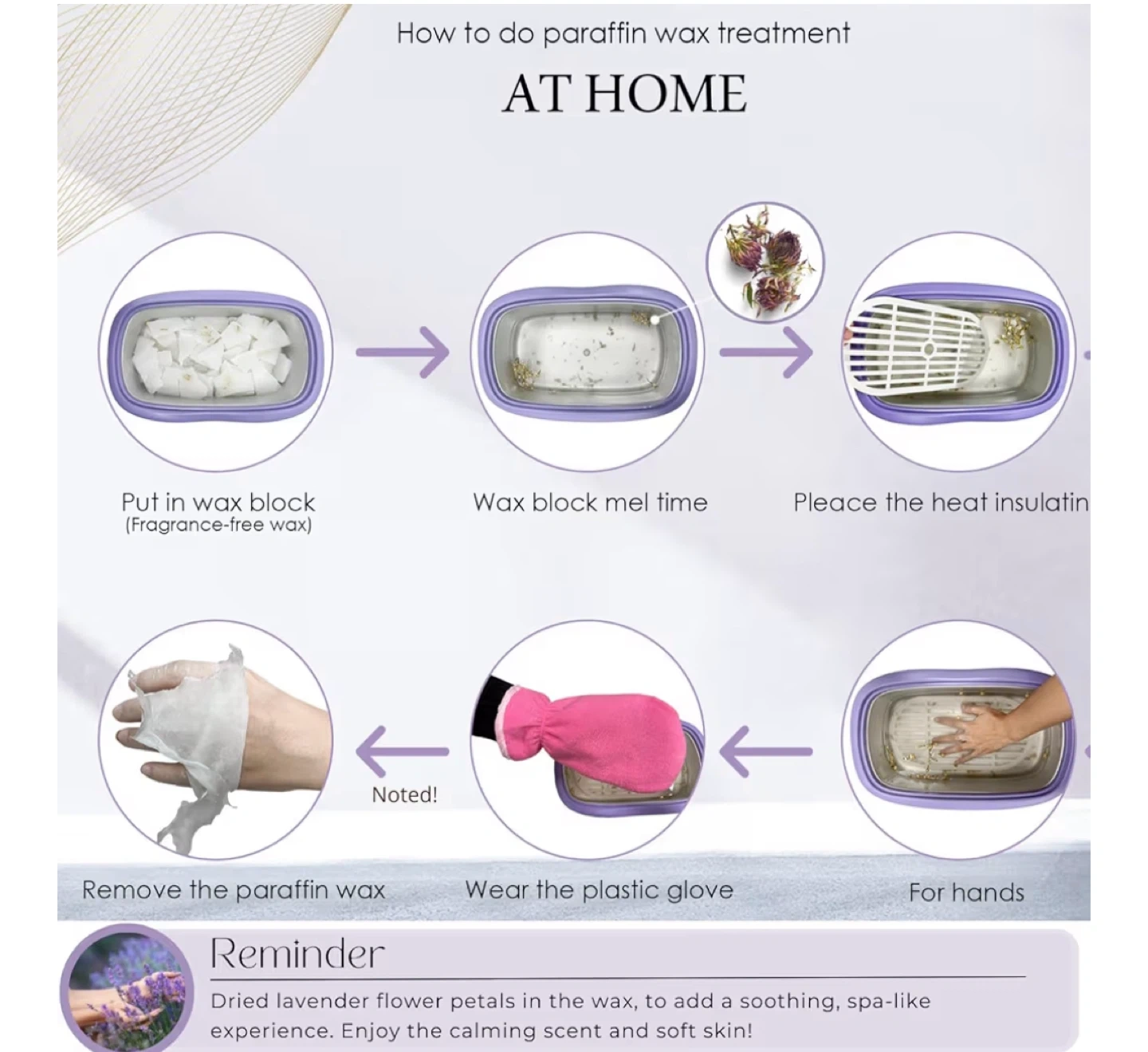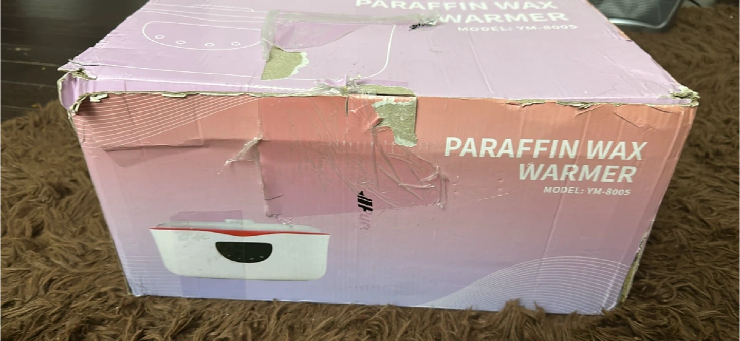 This paraffin wax warmer is designed for moisturizing and skin-softening treatments at home. It has a higher capacity of 5000ml and a larger opening, suitable for hands, feet, and elbows. The kit includes wax blocks, gloves, brushes, and plastic bags.