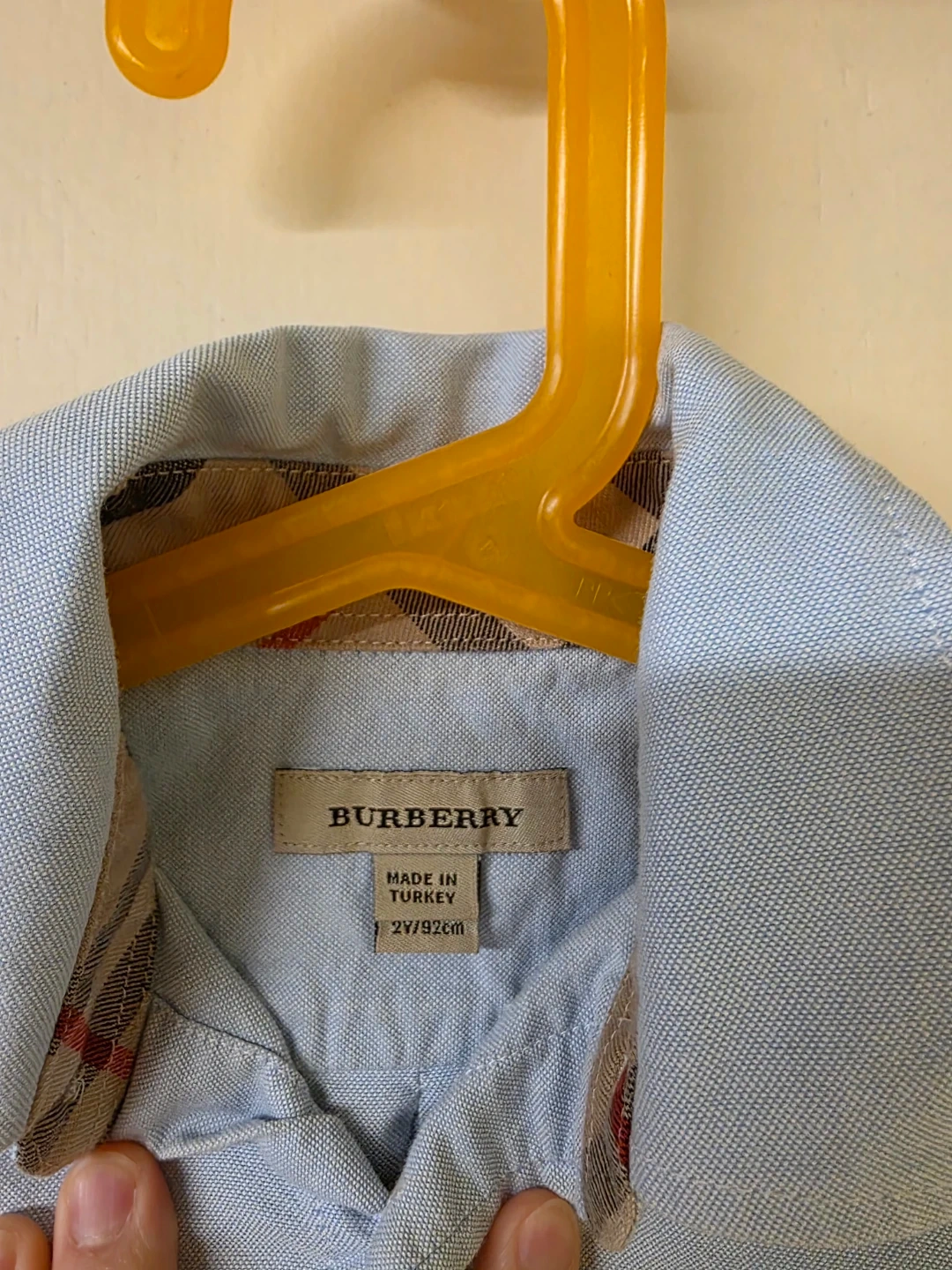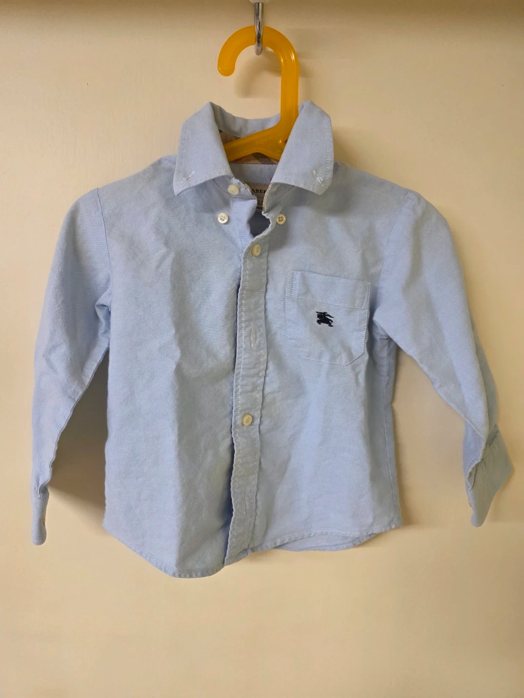Burberry button-down shirt for little ones. Made in Turkey. Classic light blue colour with embroidered knight logo. Size 2Y/92cm. Slight juice stain (as shown in picture). Pick up by South Arm.