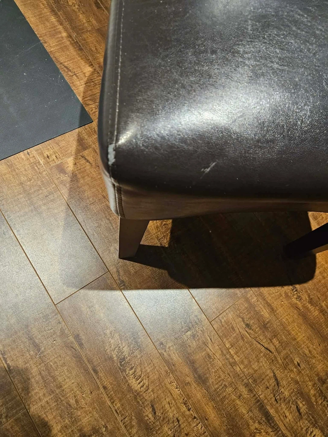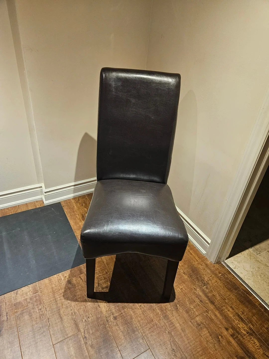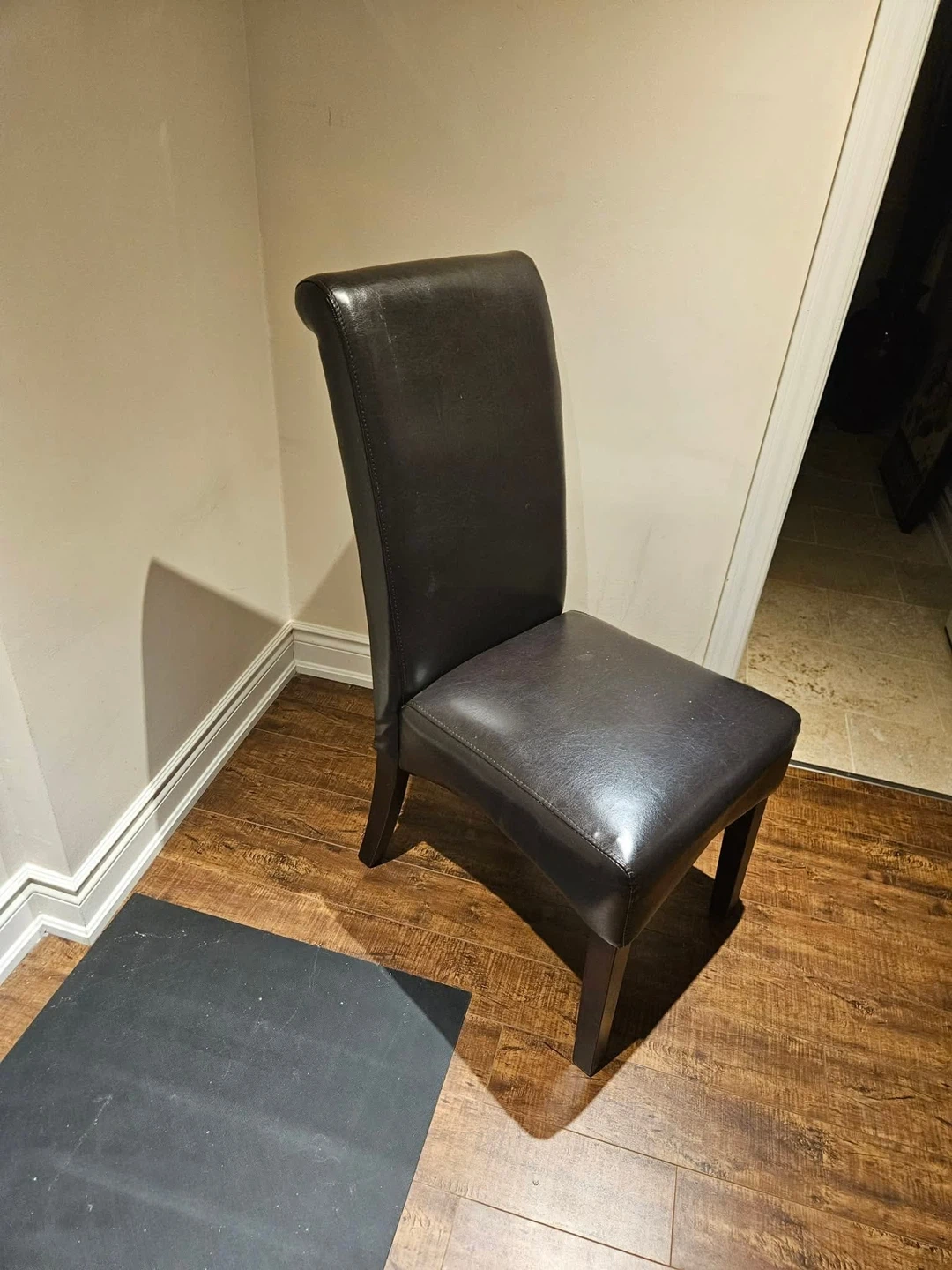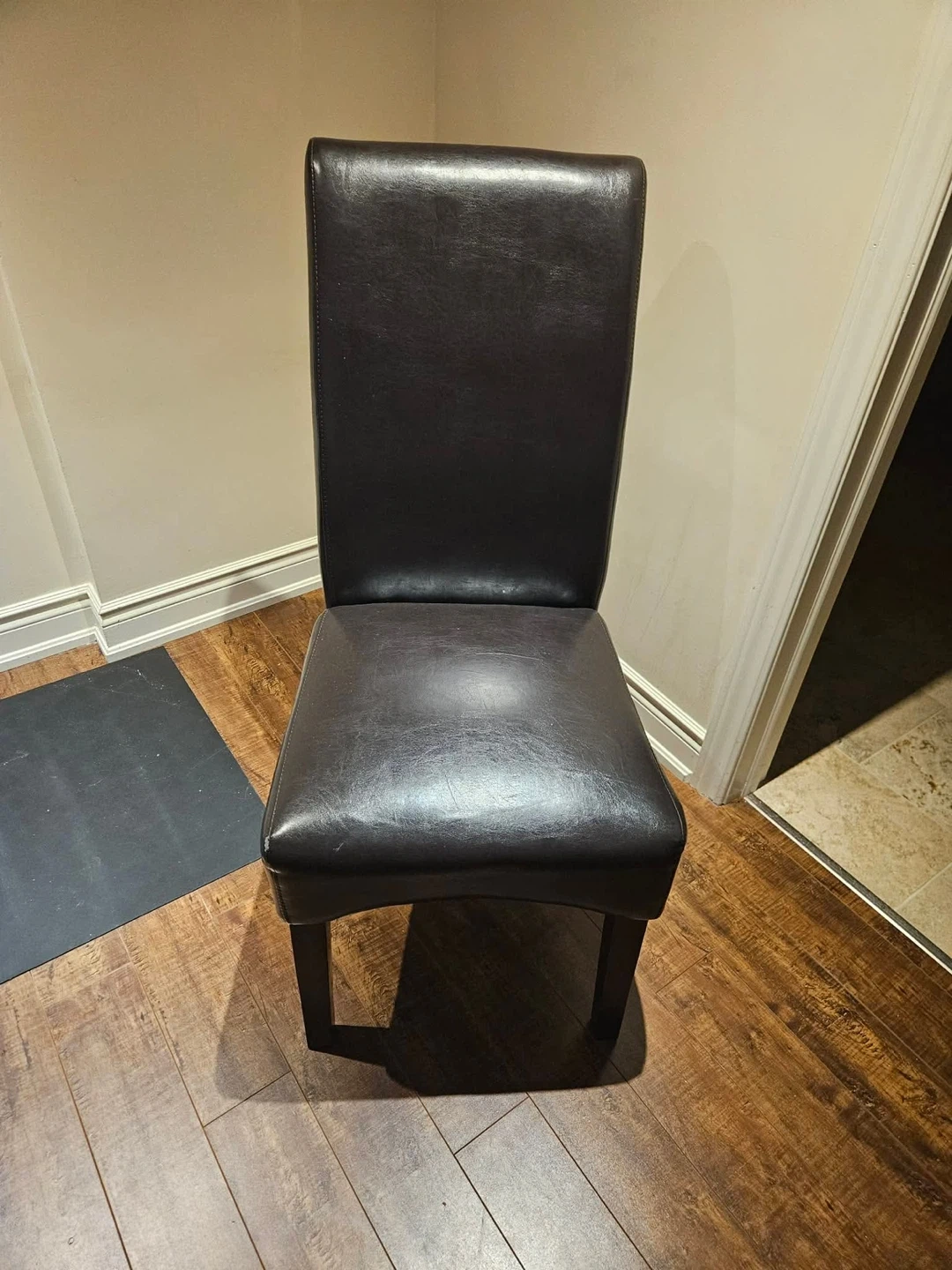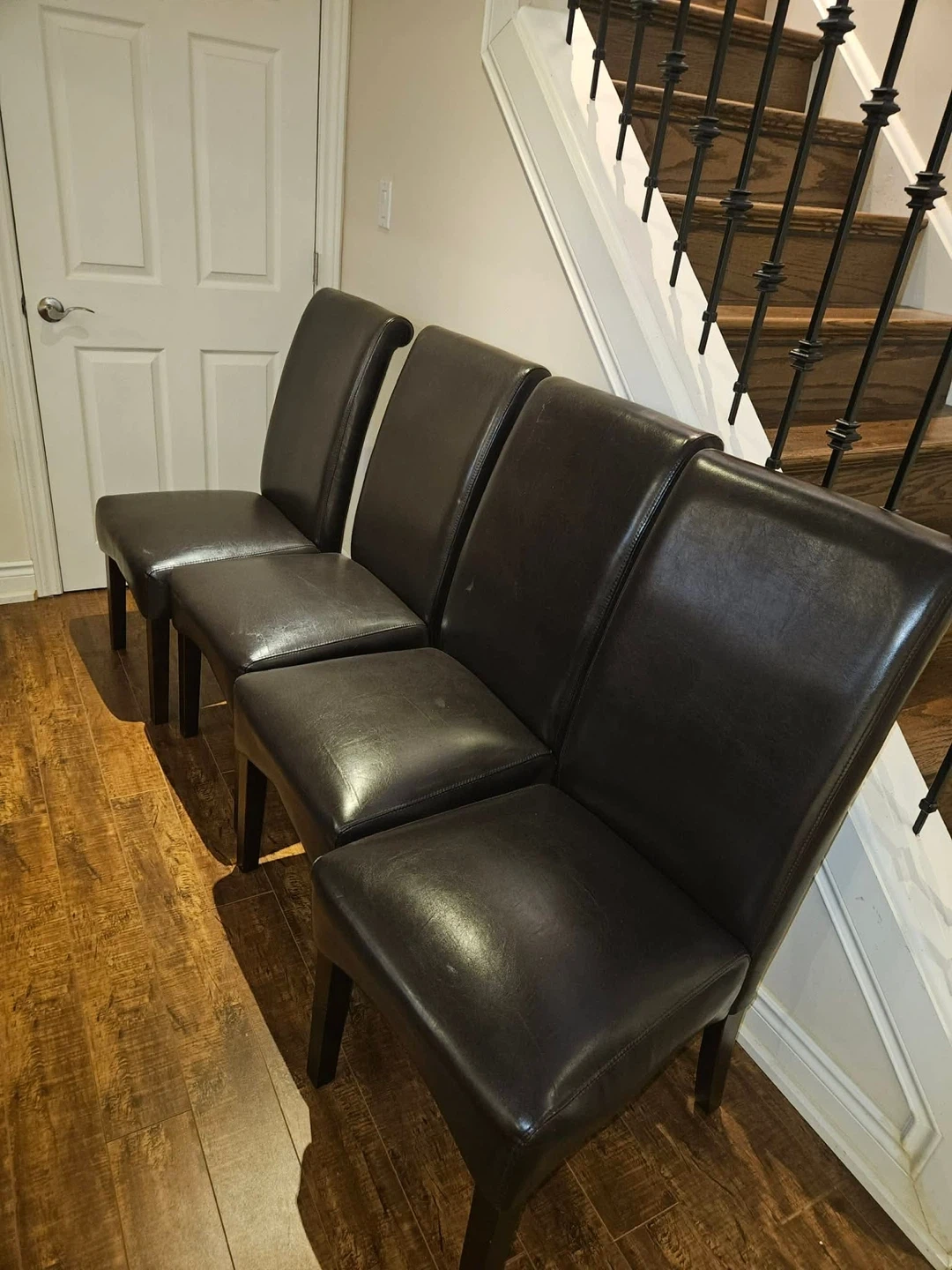 Four dining chairs with dark brown faux leather upholstery. Some minor scuffs and a small tear are present on one of the chairs. Wooden legs provide stability.