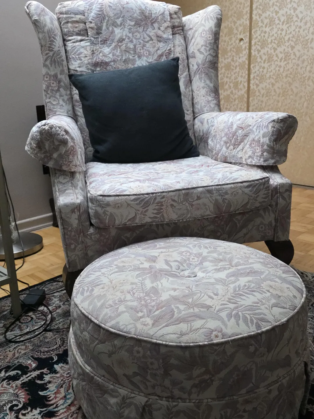 This comfortable wingback armchair comes with a matching ottoman, both upholstered in a lovely floral pattern. It's a classic set that adds a cozy touch to any living space. The chair is great for reading or relaxing. Fabric is a durable woven material. Arms and back has separate removable covers