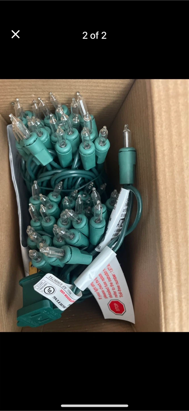 This is a box of 100 clear mini incandescent string lights from for LIVING. They're suitable for indoor or outdoor use. The string measures 20' 11" in length with 2 1/2" bulb spacing. Perfect for decorating for the holidays!