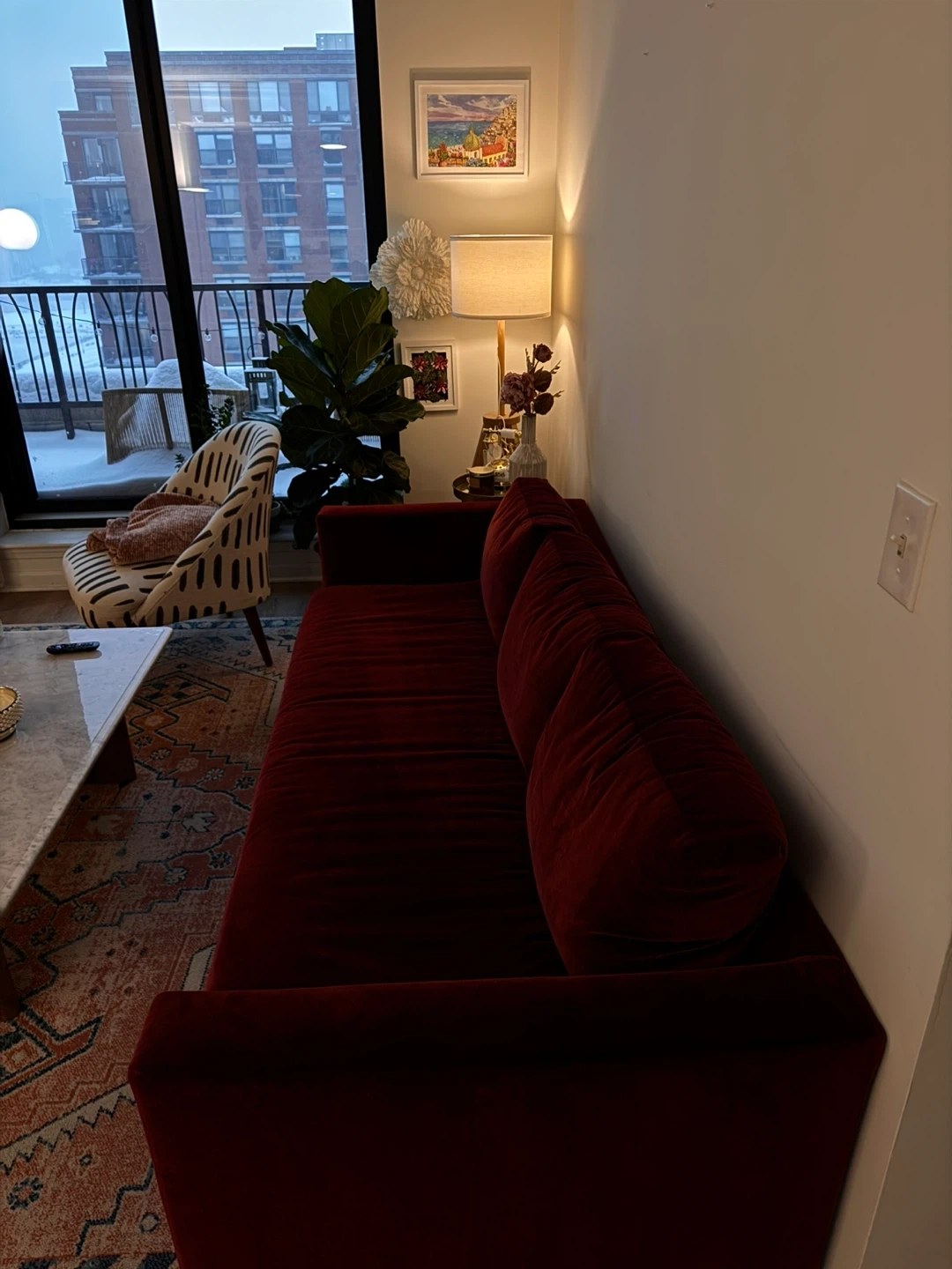 I am looking to sell our Like-new Pottery Barn Jake Petite Upholstered Sofa in the color Faux Mohair Merlot. Used only 6 months, pristine condition.