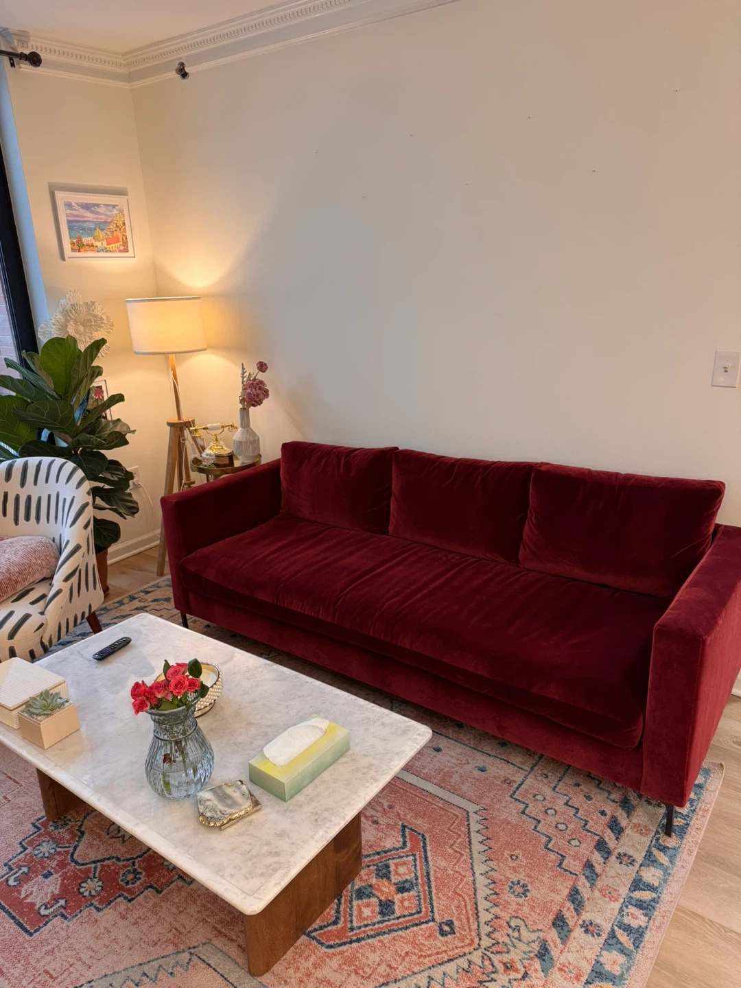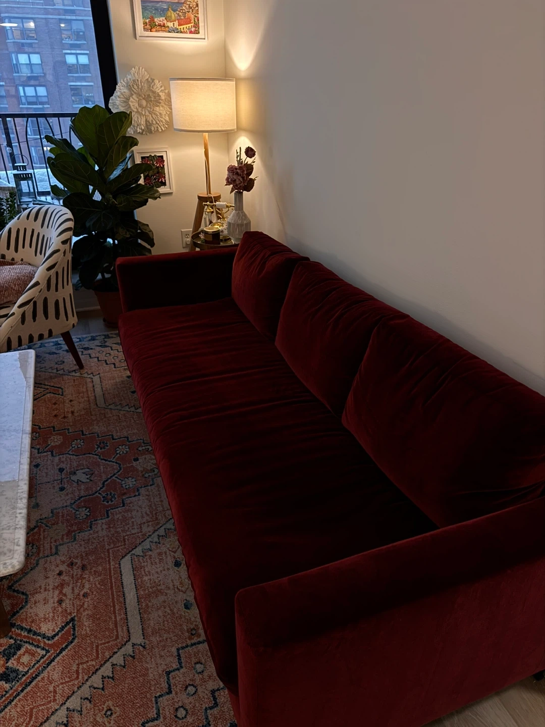 I am looking to sell our Like-new Pottery Barn Jake Petite Upholstered Sofa in the color Faux Mohair Merlot. Used only 6 months, pristine condition.