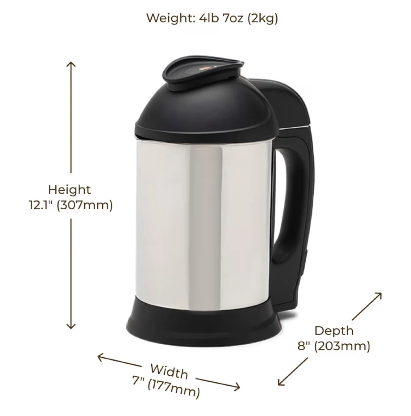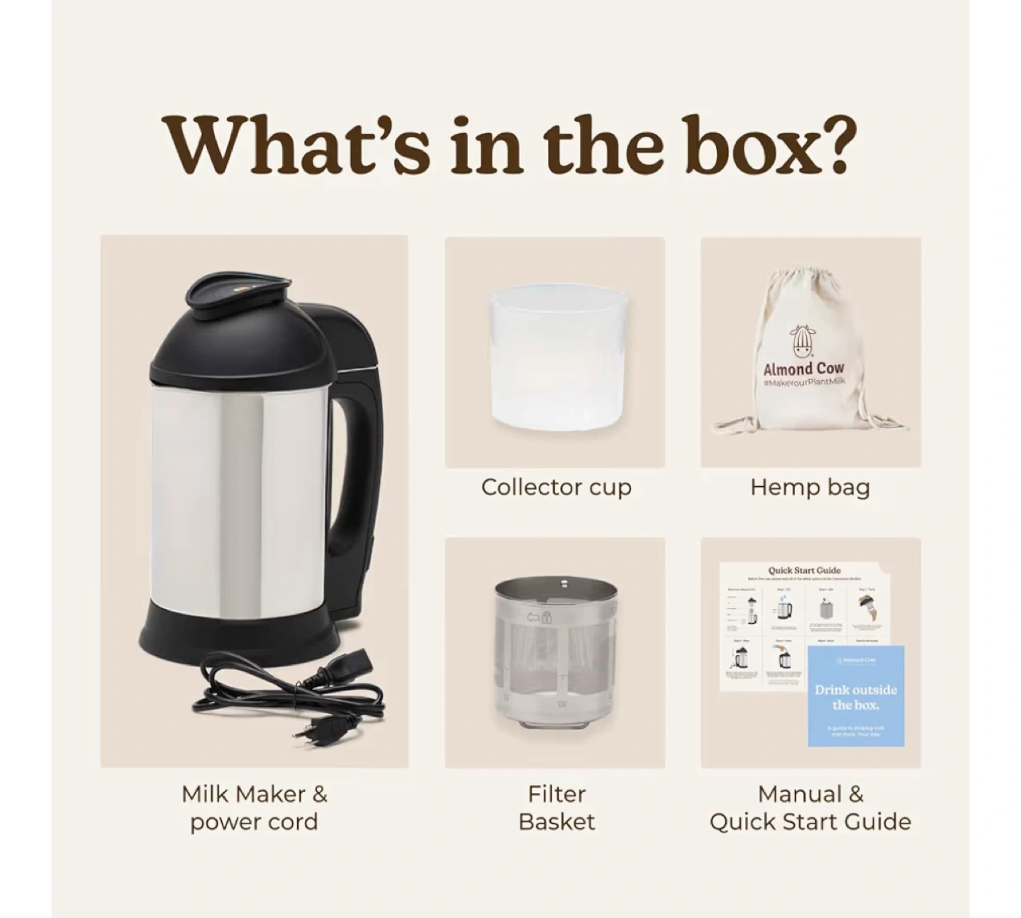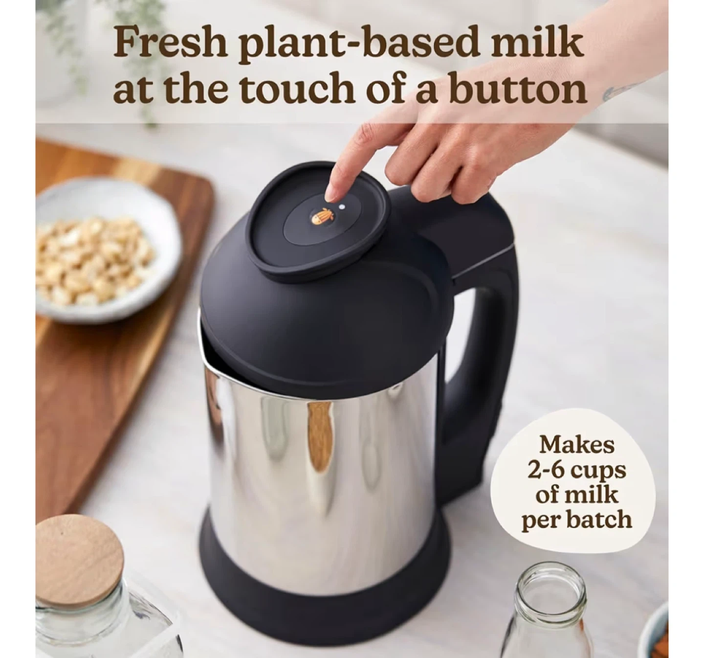 Make fresh plant-based milk at the touch of a button. This milk maker comes with a collector cup, hemp bag, filter basket, and quick start guide. It makes 2-6 cups of milk per batch.