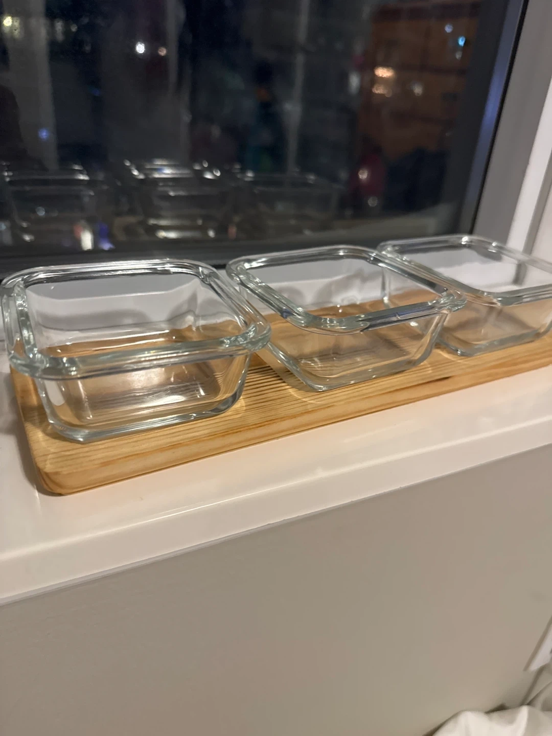 This set includes three clear glass ramekins on a wooden tray. They're perfect for serving small dishes or condiments. Glass material. (Never used)