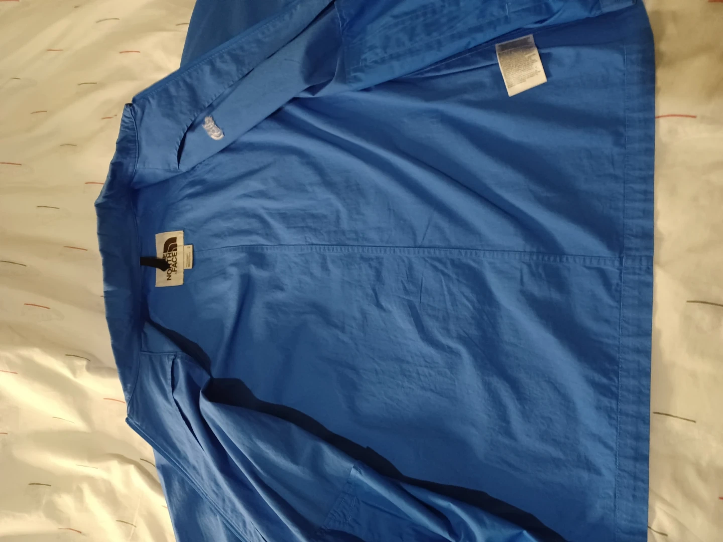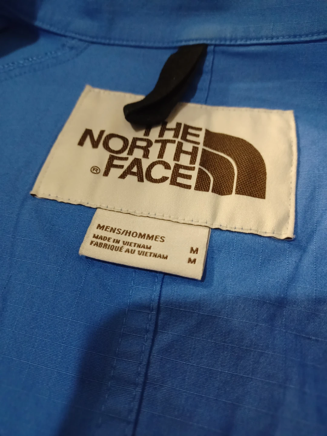 This is a blue jacket from The North Face for men. It's a size medium and made in Vietnam. It features a full-zip front and two front pockets.