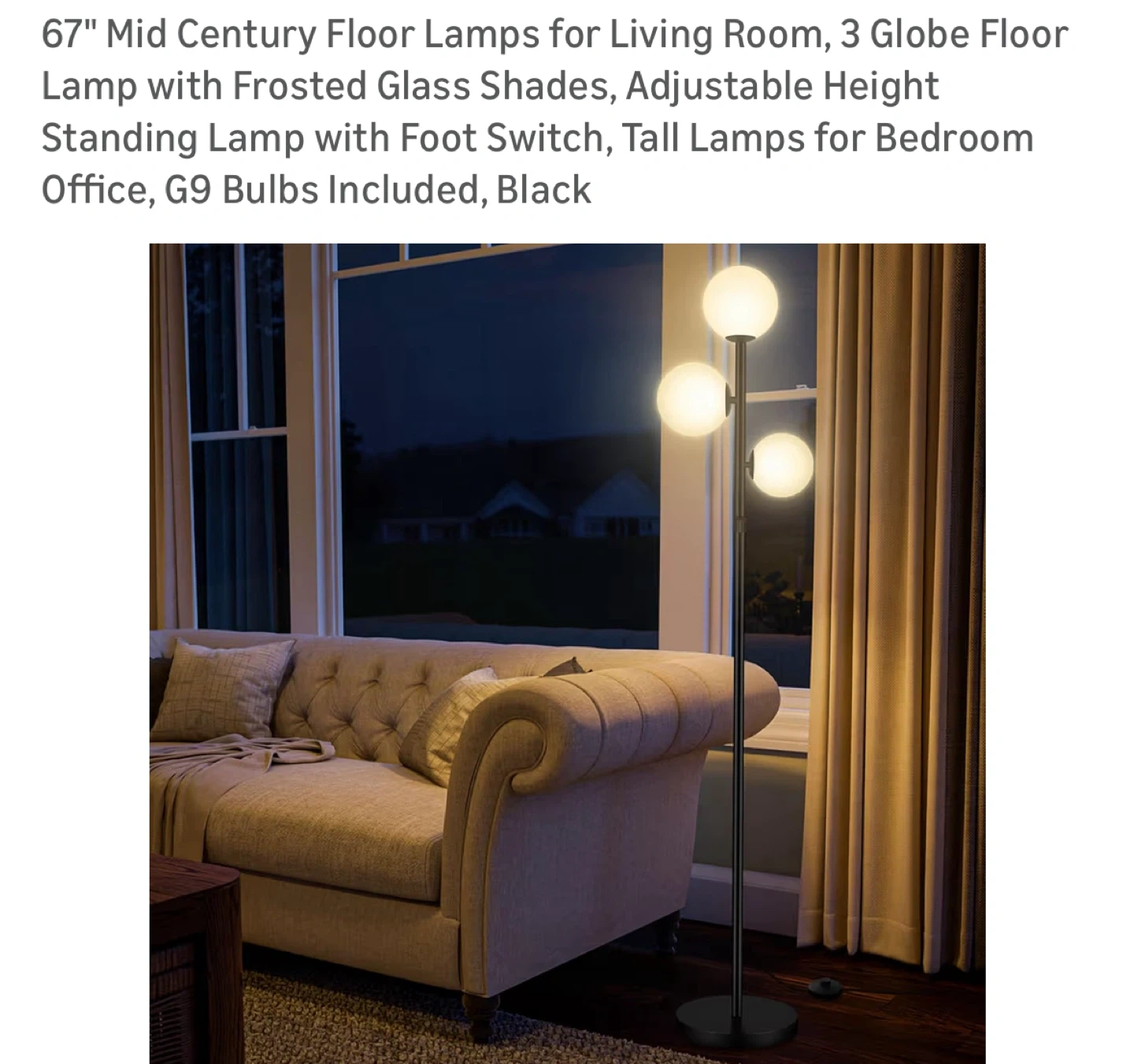 This 67-inch floor lamp features three frosted glass globe shades and an adjustable height. It has a convenient foot switch and includes G9 bulbs. It's a tall lamp suitable for a bedroom or office.