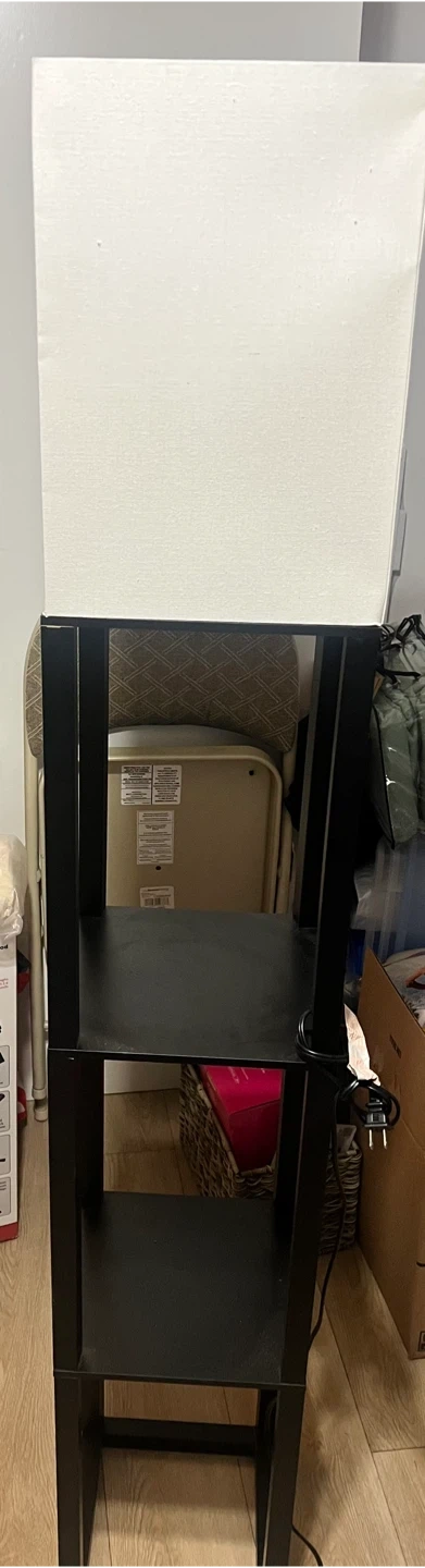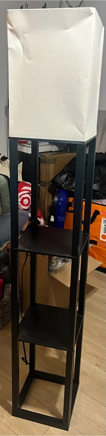 This floor lamp features a black metal frame with three shelves. It includes a white fabric lampshade and a power cord with a plug. A unique combination of lighting and storage! CASH ONLY!!