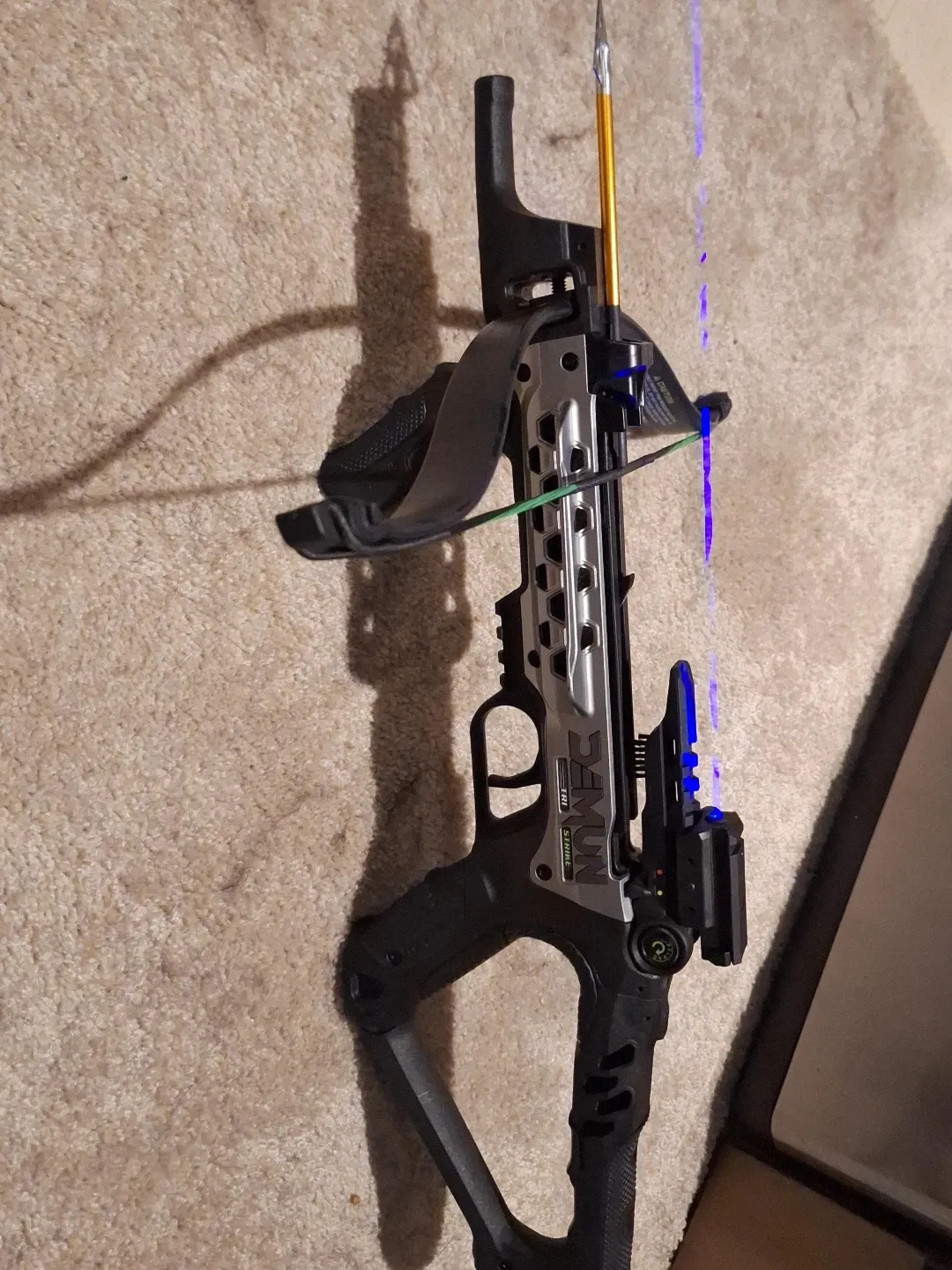 This is a SEMUN TRI STRIKE crossbow. It's black and silver with a compound bow design. Includes one arrow and a laser sight attachment.