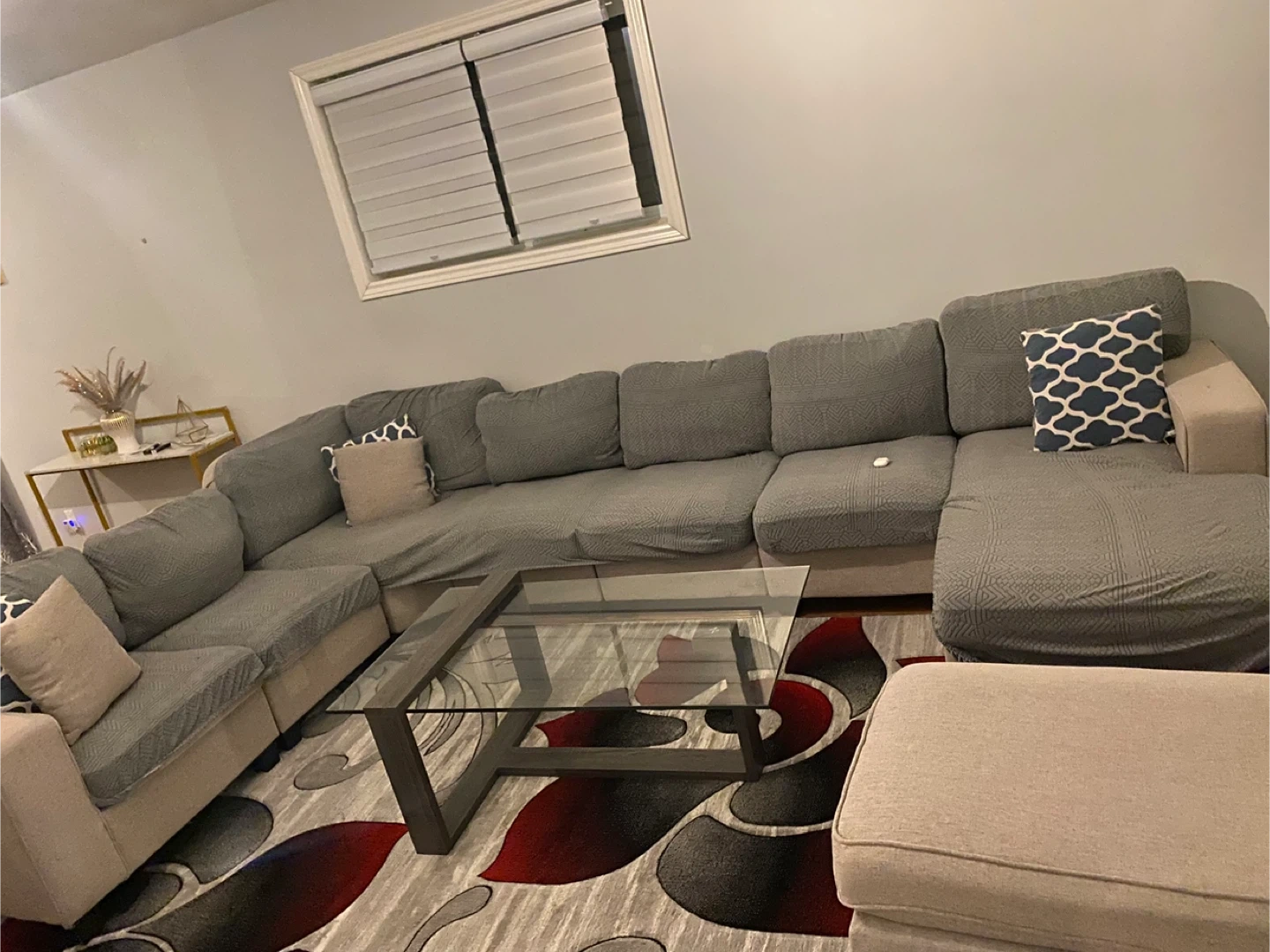 Grey upholstered sectional sofa with multiple seating modules. Includes a matching ottoman and glass-top coffee table. Perfect for a large living room space.