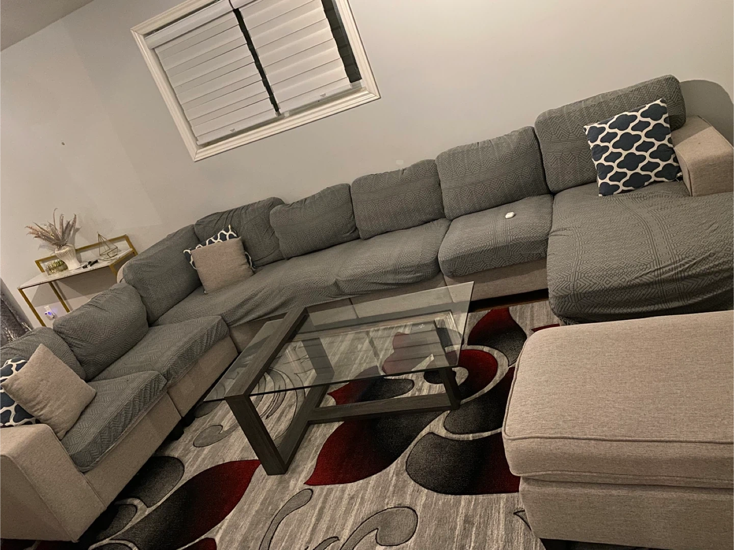 Grey upholstered sectional sofa with multiple seating modules. Includes a matching ottoman and glass-top coffee table. Perfect for a large living room space.