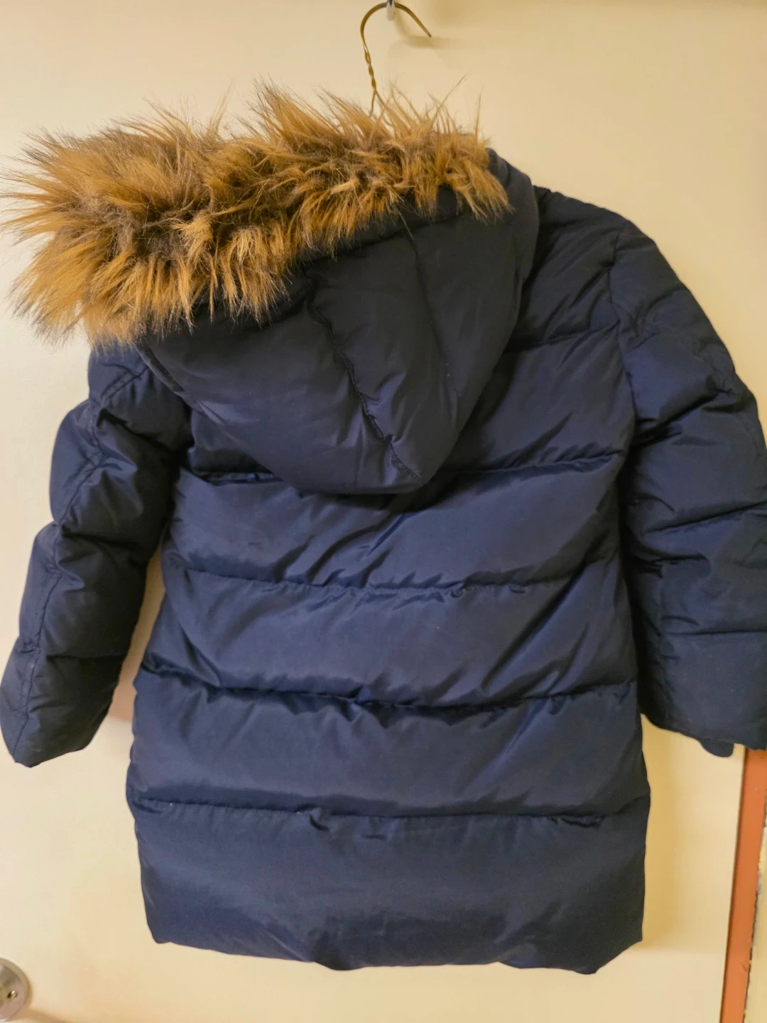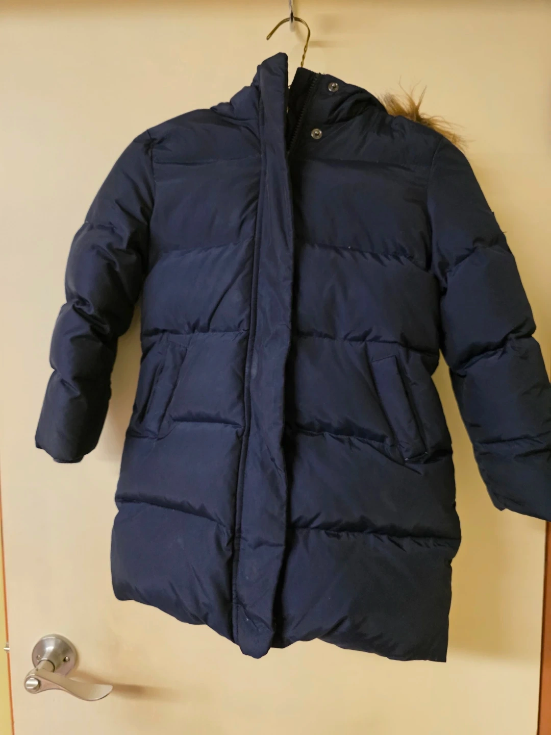 This GapKids puffer coat is navy blue and features a removable faux fur hood. It's a size S/P (6-7). It's perfect for keeping kids warm during colder months! Pick up by South Arm.