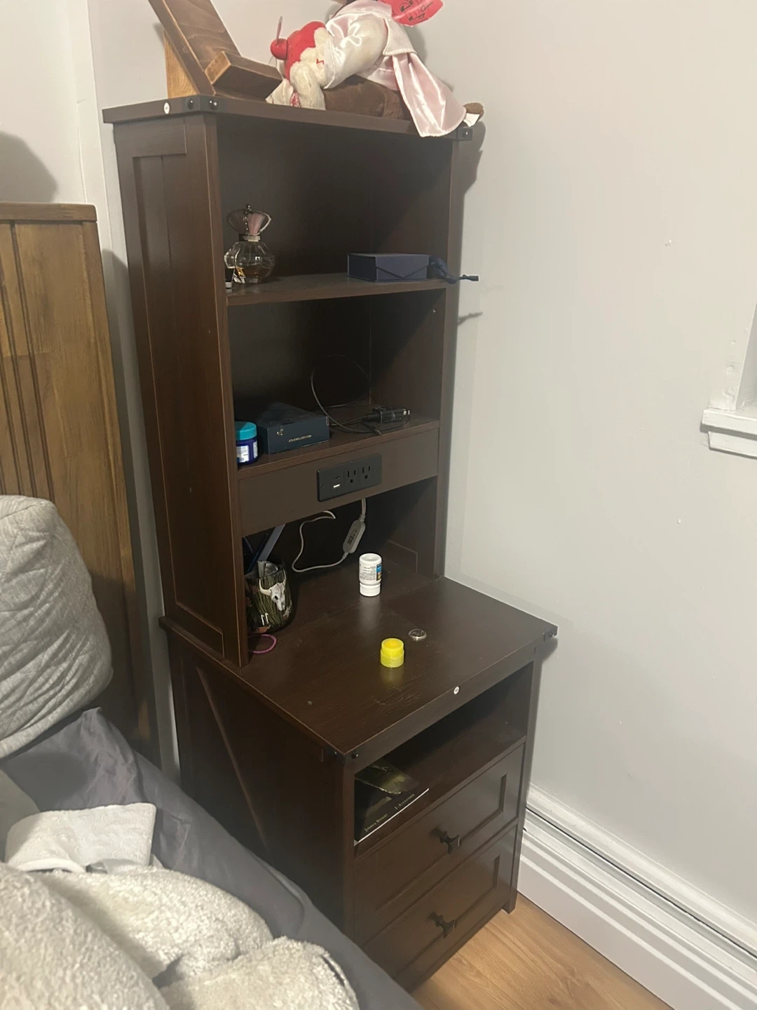 This dark wood bedside table features a built-in charging station with outlets and USB ports. It includes a drawer for storage and an open shelf above. It's perfect for keeping your bedroom tidy and devices powered up! Super cute just ended up being darker than anticipated. Our loss is your gain. One is built, one is still in the packaging.